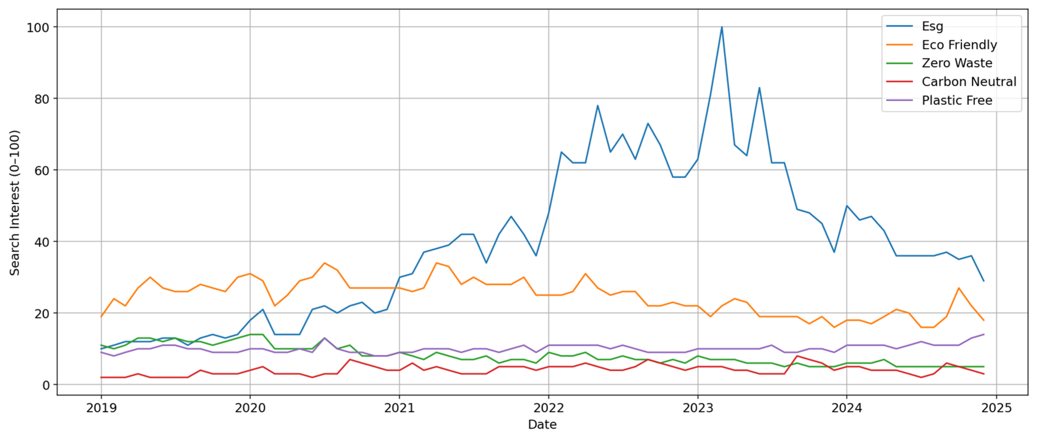 This study analyzes monthly Google Trends data in the United States from 2019 to 2024, focusing on five sustainability-related keywords. The terms “ESG” and “carbon neutral” capture institutionally oriented language common in policy documents, regulations, and corporate reports, whereas “zero waste”, “plastic free”, and “eco friendly” represent consumer-facing expressions. By comparing the search patterns associated with these two groups, we examine whether institutional attention tends to precede and shape consumer interest.