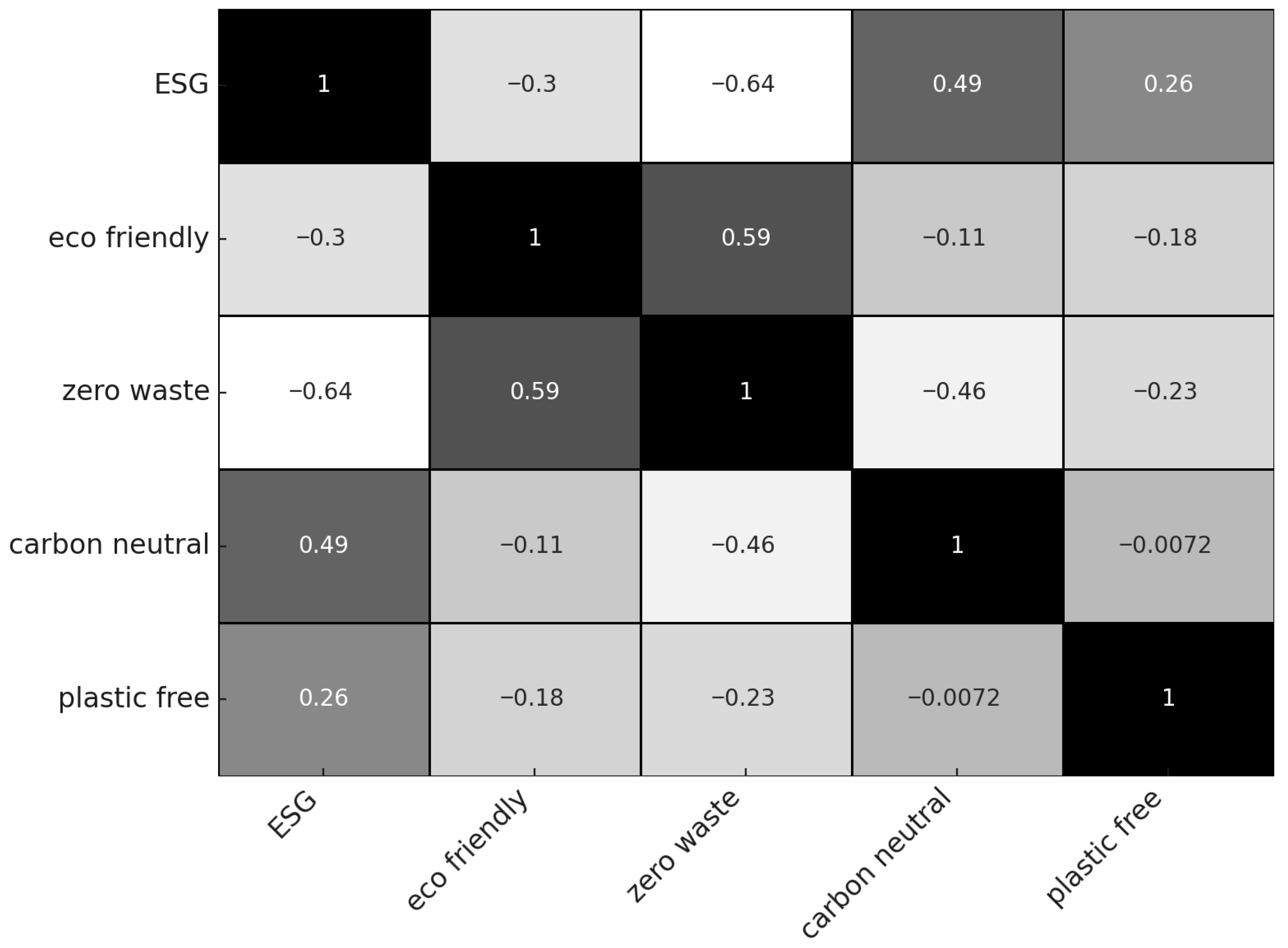 Some pairs, such as “ESG” and “plastic free”, showed weaker correlations, indicating that influence may vary depending on conceptual proximity and public familiarity with the terms.