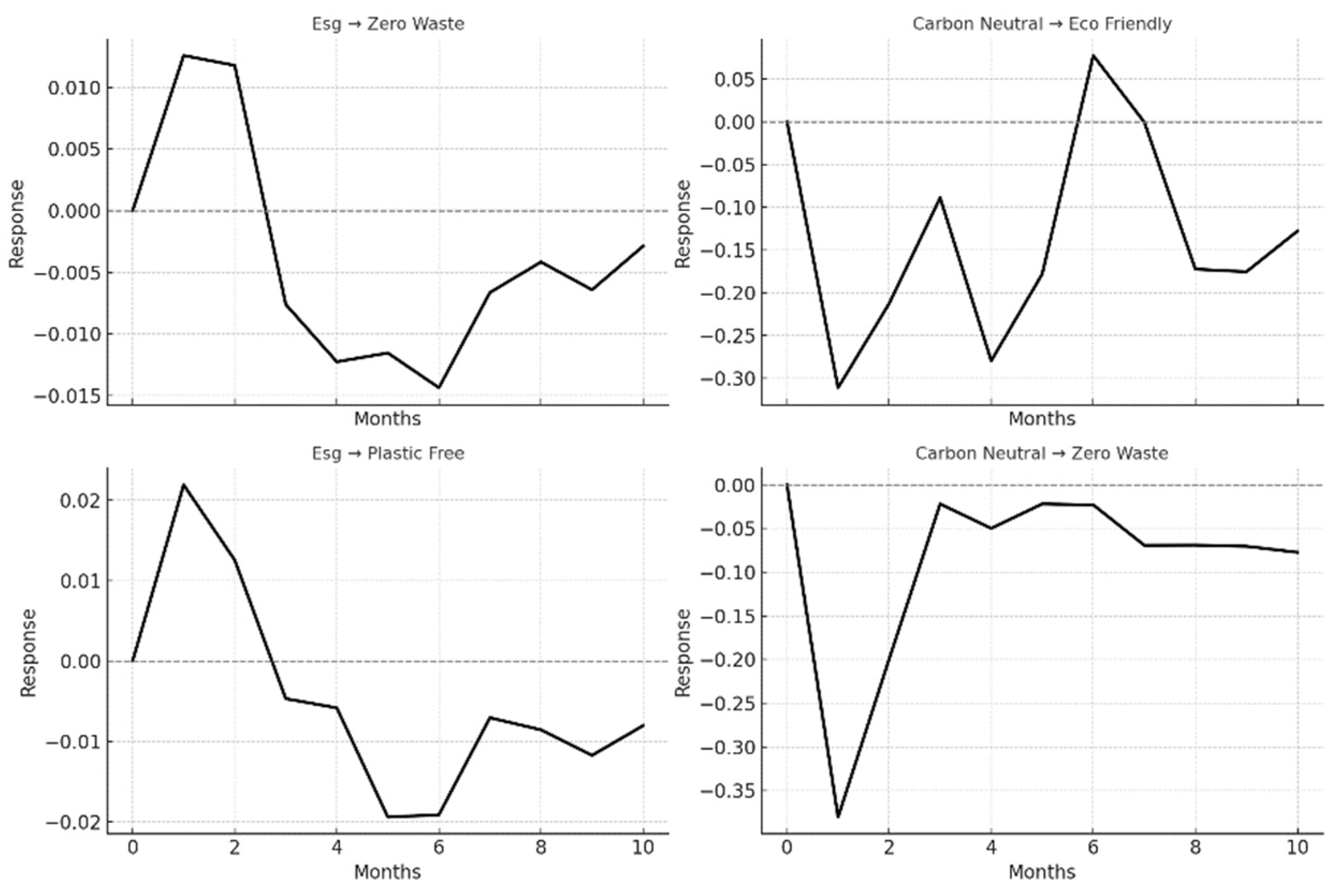 In conclusion, this study contributes to the emerging field of digital sustainability analytics by revealing how institutional discourse diffuses over time and shapes consumer interest in measurable ways. The results show, for example, that “ESG” predicts “eco friendly” searches with a three-month lag (p = 0.024) and “zero waste” with a one-month lag (p = 0.035), while “carbon neutral” predicts “zero waste” across one- to three-month lags (p <0.01). The strongest cross-correlations (above r = 0.70) appeared between “ESG” and “zero waste”, and between “carbon neutral” and “eco friendly”, with effects most pronounced at one- to two-month lags. Impulse response analysis further revealed that ESG effects persisted for roughly four months, whereas carbon neutral effects were immediate but short-lived, returning to baseline within one month.