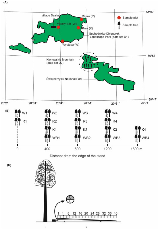 For this study, forest stands growing in the Świętokrzyskie Mountains, located in central Poland, were selected (Figure 1A). The Świętokrzyskie Mountains are characterised by a cooler climate compared to that of its surrounding regions. The average annual temperature ranges from 6 to 7 degrees Celsius, and precipitation reaches 650–900 mm per year. Winds blow at an average speed of 2.5–4 m/s, and the windiest months are December, January, and February, when gusts of up to 10 m/s can occur. The highest rainfall is recorded in July. The number of rainy days averages between 120 and 170 per year, while frost or freezing temperatures occur for about 100 to 135 days. Snow cover persists for 50 to 90 days, reaching its maximum depth in January and February [46]. Data were collected in 2022 (Dataset D1) and 2023 (Dataset D2) from forests containing P. sylvestris in this region.
