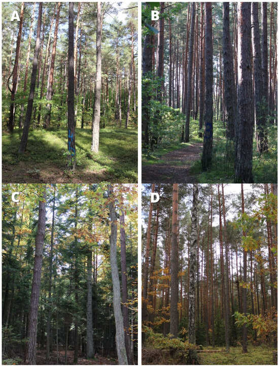 General view of the tree stand and geographical coordinates in the Występa 50°58′53″ N, 20°40′49″ E (A); Rejów 51°04′32″ N, 20°49′01″ E (B); Kruk 51°03′14″ N, 20°48′01″ E (C); and Wilczy Bór 51°03′09″ N, 20°40′24″ E (D) forest subdistricts.