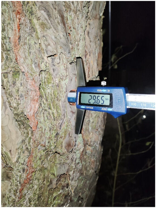 On the sample trees, the stem diameter and bark thickness at breast height were measured. To measure bark thickness, a hole was drilled in the stem using a hole cutter with a diameter of 2 cm. Following bark removal, the depth of the hole was measured (with an accuracy of 0.01 mm) using an electronic depth gauge (Figure 3).