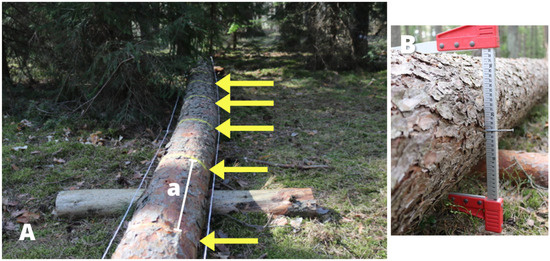 In late January and early February 2022, the trees were felled. They were then placed on supports, made from dead wood, at a height enabling insect colonisation on the entire circumference of the stems. These were trap trees used for bark beetle monitoring [47]. The stems were then divided into 2.5% units (u) (Figure 1C and Figure 4).