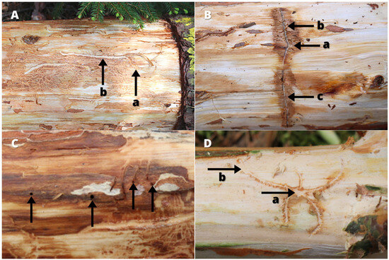 Species of bark beetles identified on trap trees based on galleries. (A) Tomicus piniperda: a—nuptial chamber, b—egg gallery; (B) Tomicus minor: a—nuptial chamber, b, c—shorter and longer arms of the egg gallery, respectively; (C) The arrows indicate holes made by Trypodendron lineatum; (D) Pityogenes bidentatus: a—nuptial chamber, b—egg gallery.