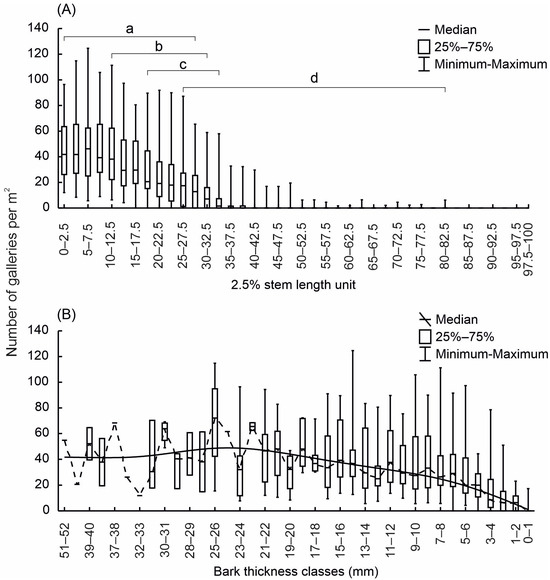 Density of Tomicus piniperda galleries on trap trees (Dataset D1). (A) Mean density of galleries for the successive 2.5% stem length unit; a, b, c, d means marked with different letters indicate that they are statistically significant (Kruskal–Wallis test, p < 0.05), (B) real (broken line) and smothed (solid line) distribution of gallery density for the successive bark thickness classes.