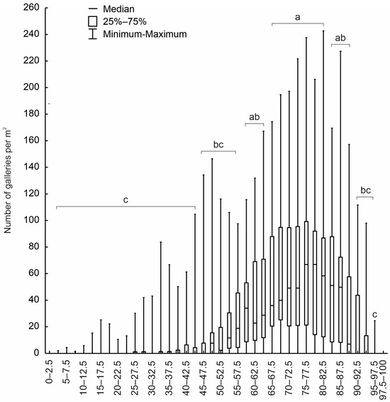 Mean density of Tomicus minor galleries for the successive 2.5% stem length unit; a, b, c means marked with different letters indicate that they are statistically significant (Kruskal–Wallis test, p < 0.05—Dataset D1).