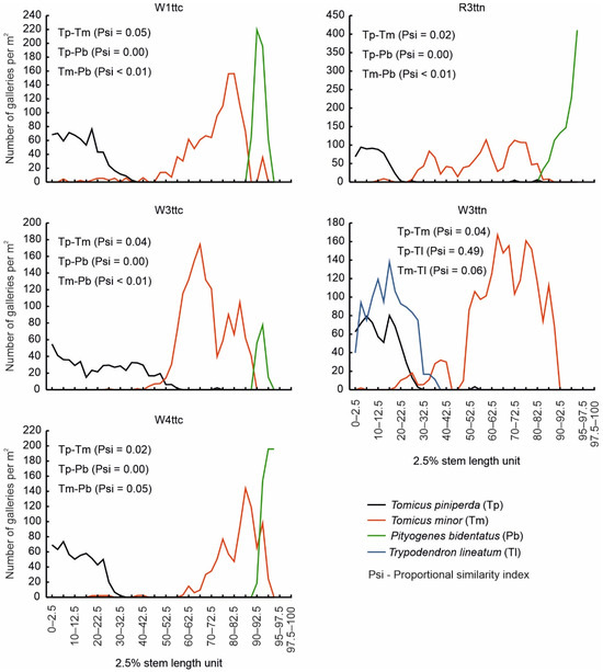 All calculations and statistical analyses were carried out using Statistica software, version 13.3 (TIBCO Software Inc., Tulsa, OK, USA) [52]. Prior to the data analysis, the normality and homogeneity of the variances were checked using the Shapiro–Wilk and Levene tests [53]. To test differences in infestation density between the upper and lower stem sections, a t-test was used, while the uniformity of the distribution of bark beetle galleries on stems was assessed using the Kruskal–Wallis test. In order to establish the mean infestation density of T. piniperda galleries in different bark thickness classes, a curve was fitted using the smoothing procedure of distance-weighted least squares. Polynomial (second-order) regression was performed for each value on the X-variable scale to determine the corresponding Y value such that the influence of the individual data points on the regression decreased with their distance from the particular X value [54]. To assess differences in niche breadth on stems belonging to three bark thickness classes—class 1 (below 30 cm), class 2 (30–40 cm), and class 3 (above 40 cm)—one-way ANOVA was applied. Post hoc analysis was performed using Tukey’s LSD test.