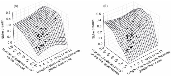 T. piniperda infested stems belonging to all bark thickness classes (Figure 6B). The smoothed distribution of infestation density (Figure 6B) shows a gradual reduction after reaching the value representing the culmination of colonisation (72.1 galleries/m2). Maximum colonisation was found in bark with a thickness of 14–15 mm (124.7 galleries/m2). Galleries in the thinnest bark (1.7%) were found only in grey-brown bark covering stems in the nodal zone. The niche breadth on stems with a diameter above 40 cm is larger than that on thinner stems (ANOVA: F2,39 = 10.293, p = 0.0004; post hoc LSD procedure for α = 0.05).