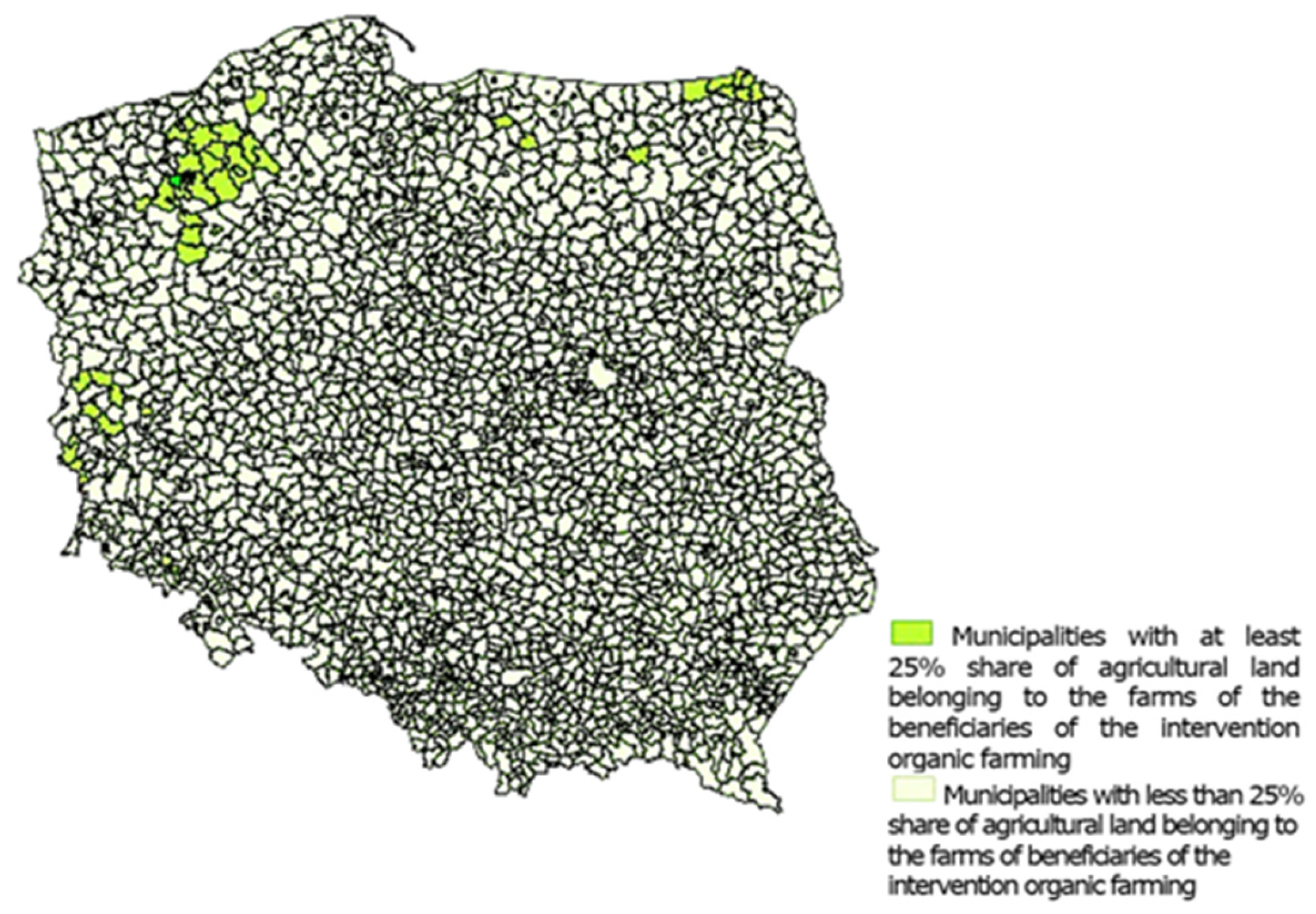 | Specification | Municipalities with at Least 25% Share of Agricultural Land Under Organic Farming Measure in Total Agricultural Area | Other Municipalities |
