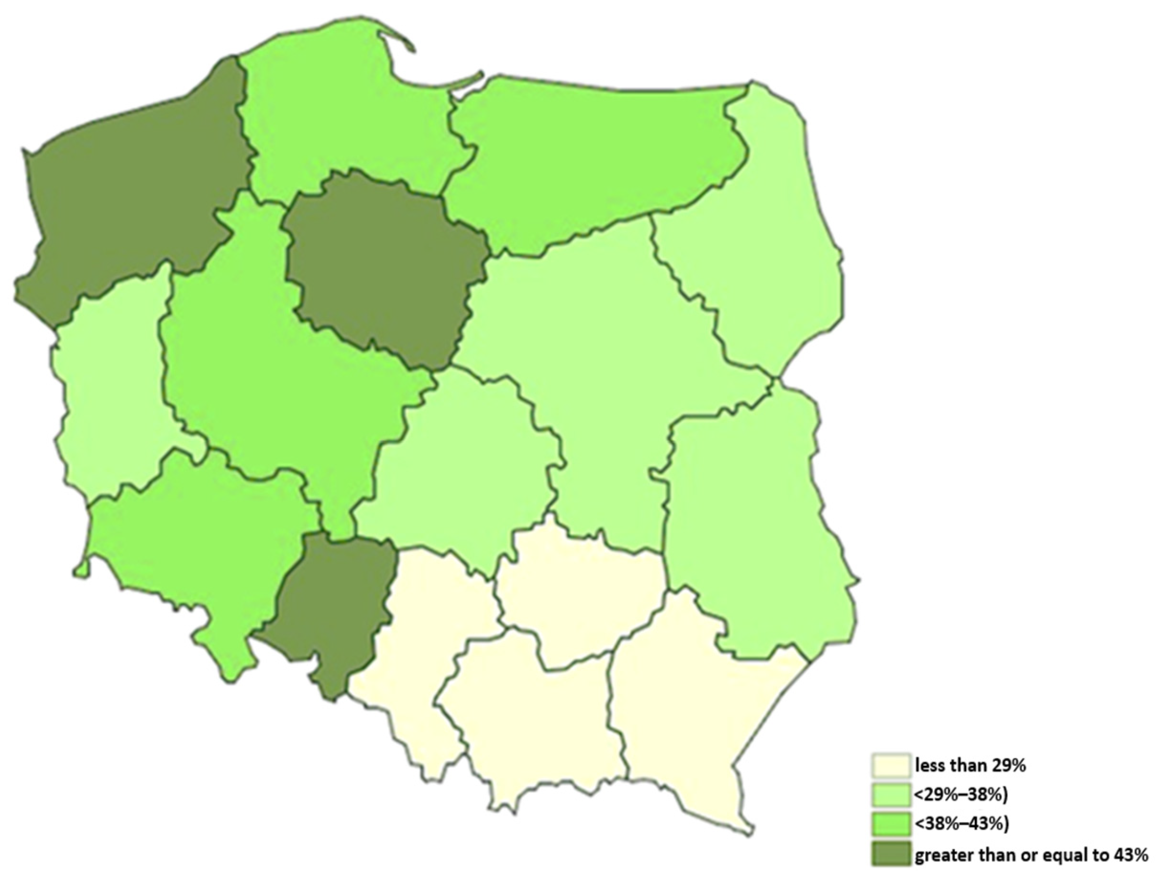 | UAA (thousand hectares), including % share: | 9950.9 | 4144.0 |