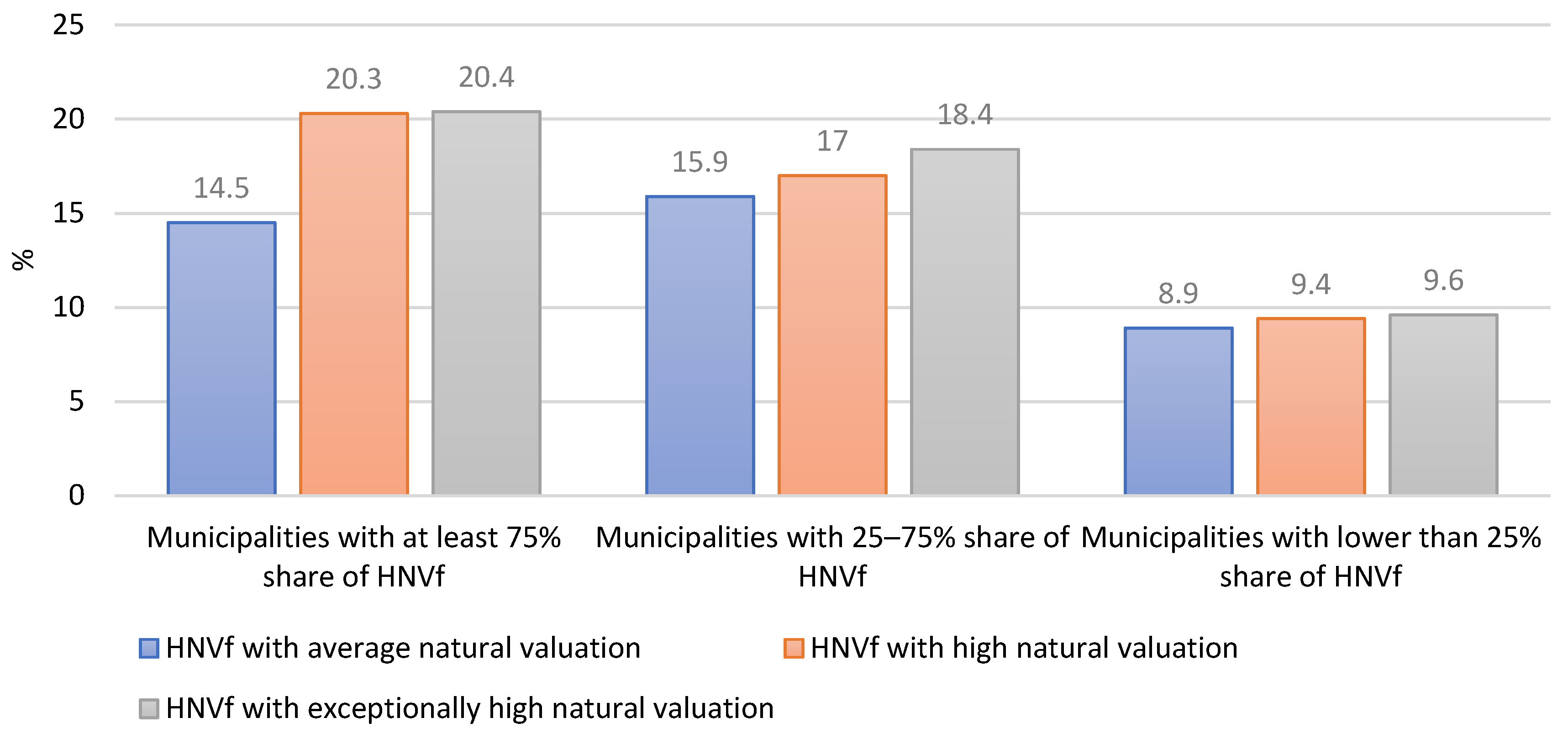 - Environmental interventions (agri-environment-climate measures, organic farming) play a much more significant role in municipalities with high concentrations of HNVf, particularly in areas of high or exceptional high environmental value. In these municipalities, the total area covered by such interventions often exceeds 20% of the utilized agricultural area, compared to less than 10% in municipalities with a low HNVf presence (<25%).