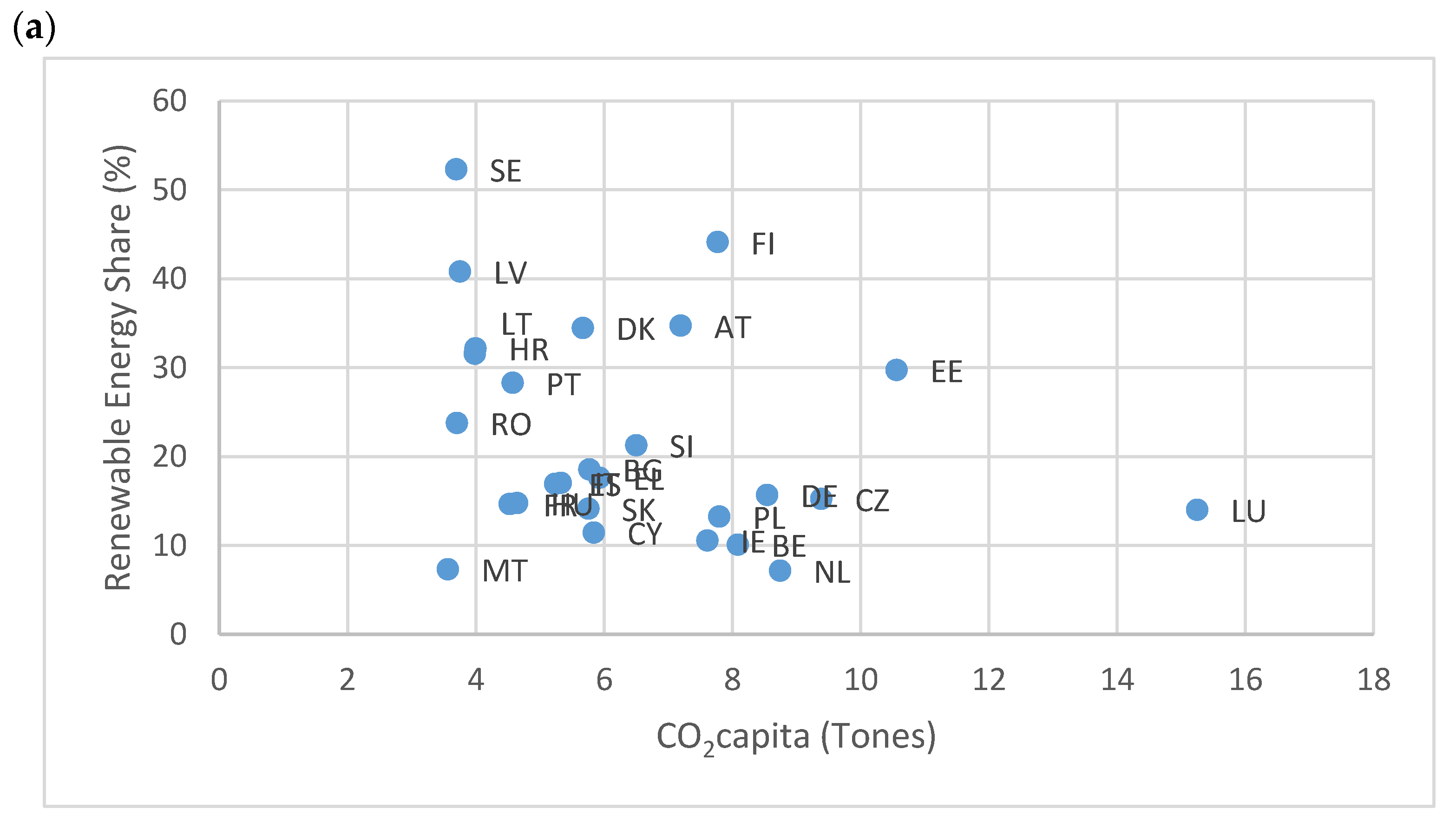 Figure 1a, there is considerable variability across EU countries in the two green transition indicators. Specifically, countries such as Sweden, Latvia, Lithuania, and Croatia maintain extremely low per capita CO
