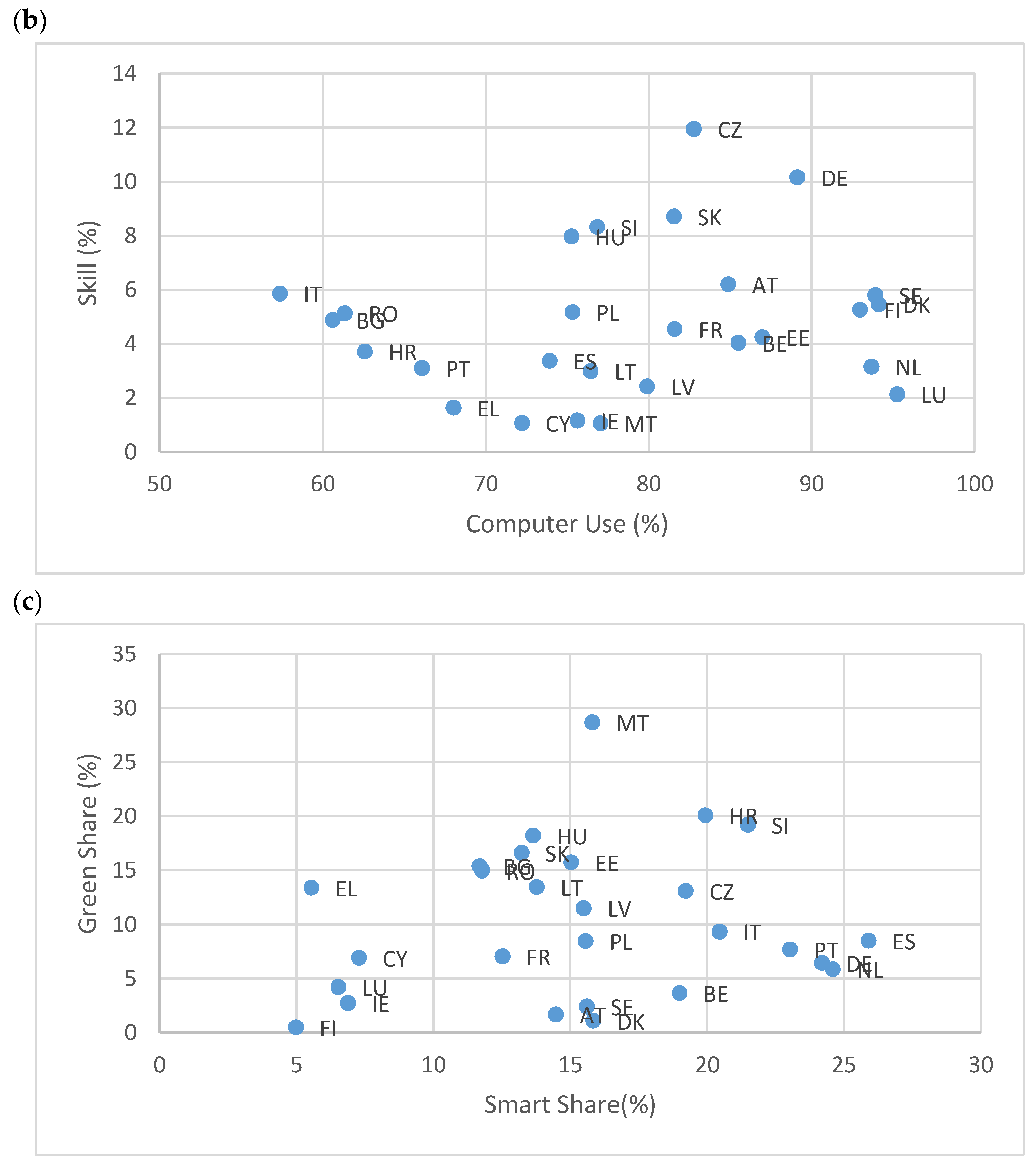Figure 1b presents countries’ performance regarding the dynamics of the smart transition. Here, the pattern differs: apart from Germany and, to a lesser extent, Czechia, no country displays exceptional or critically poor outcomes on both indicators. Therefore, all countries face challenges in moving toward a smarter society, highlighting the necessity of using multiple metrics to capture the transition’s multidimensional nature.