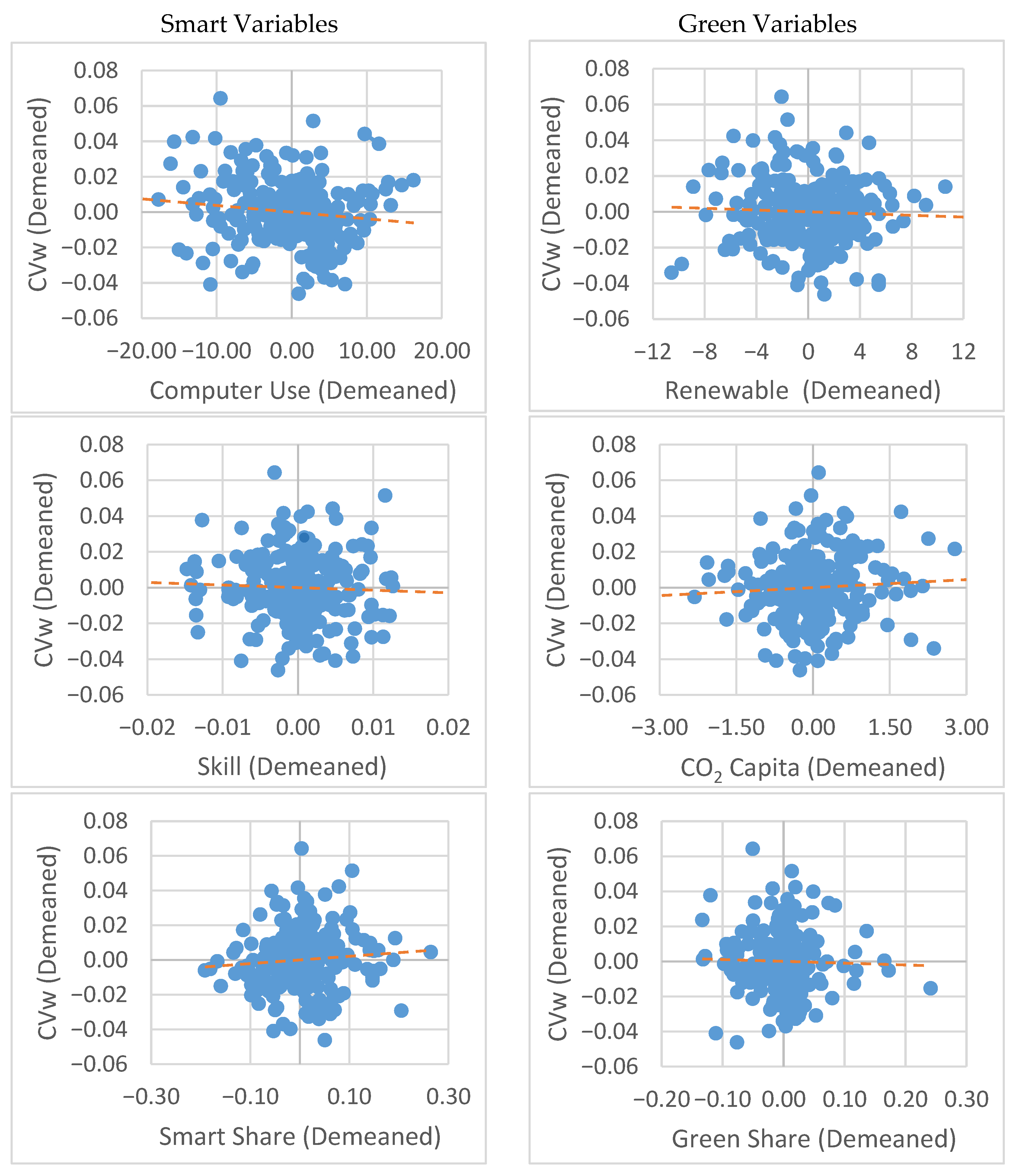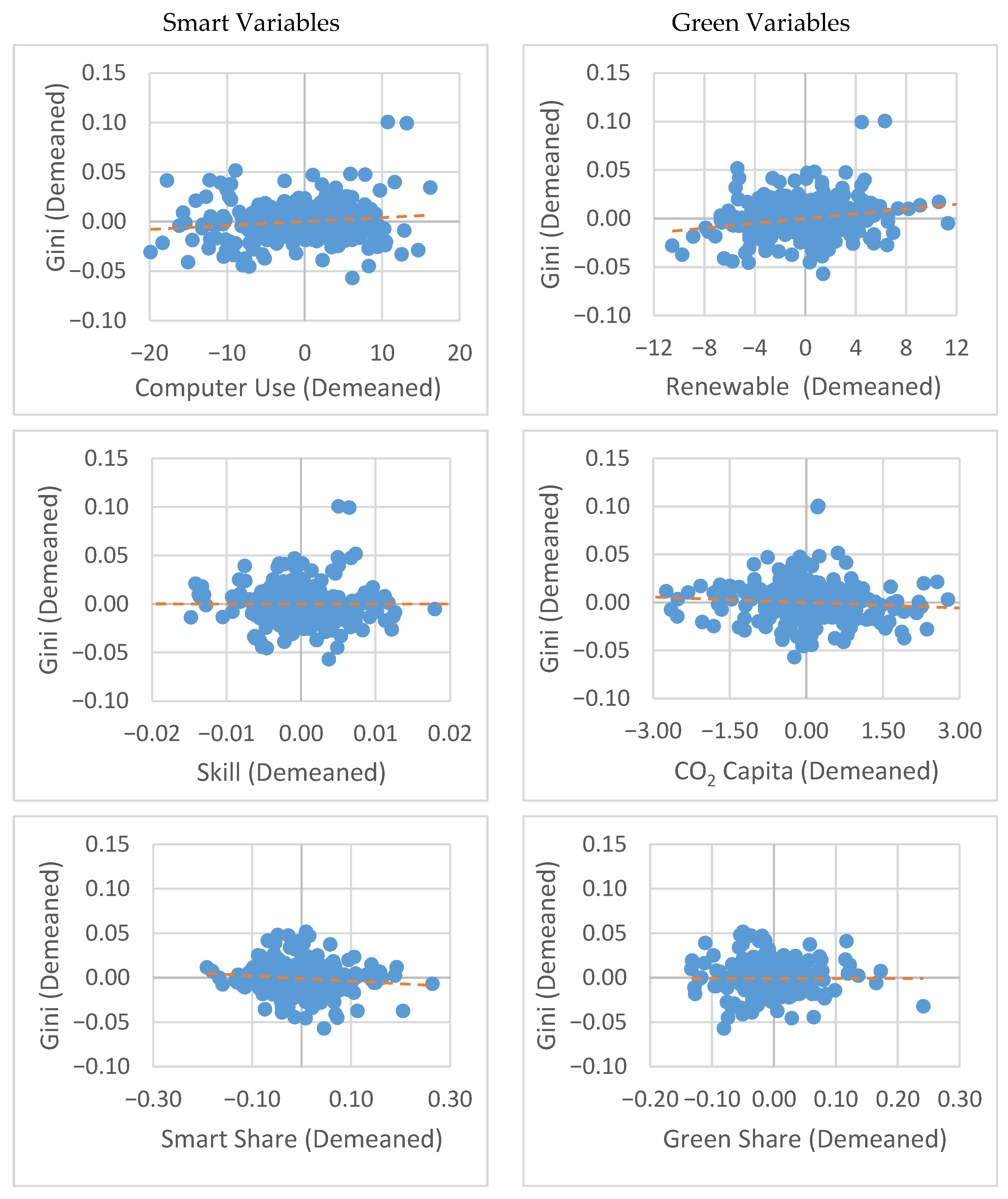 We also present scatterplots illustrating the relationships between the variables of green and smart transition dynamics, policies, and the inequality measures CVw and Gini. Since panel data models are employed, the scatterplots are constructed using the demeaned values of the variables to better capture their associations in a multi-period context.