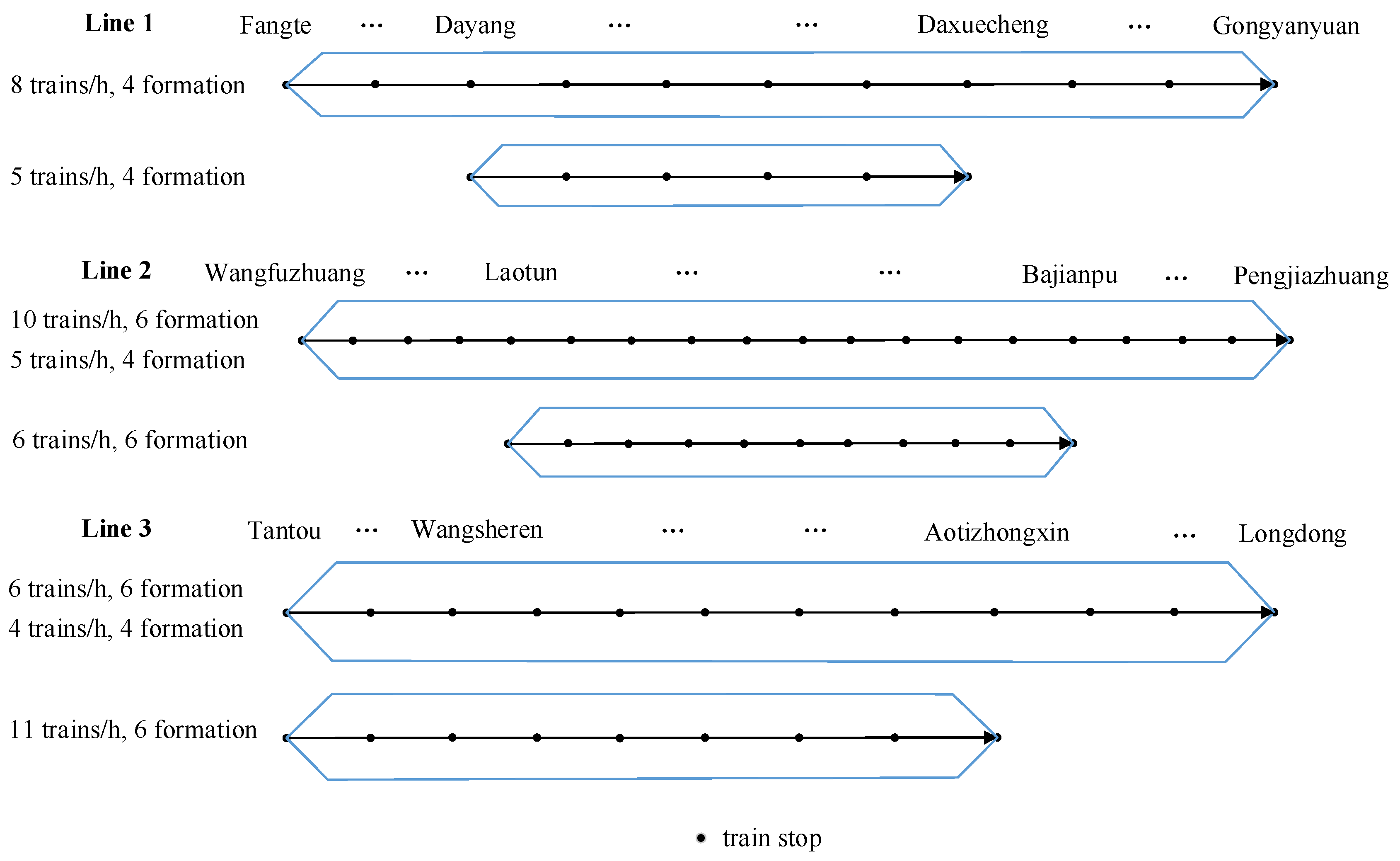| Long-formation model | 9 trains/h, 6 formation | Long routing: 14 trains/h, 6 formation Short routing: 6 trains/h, 6 formation | Long routing: 9 trains/h, 6 formation Short routing: 11 trains/h, 6 formation |