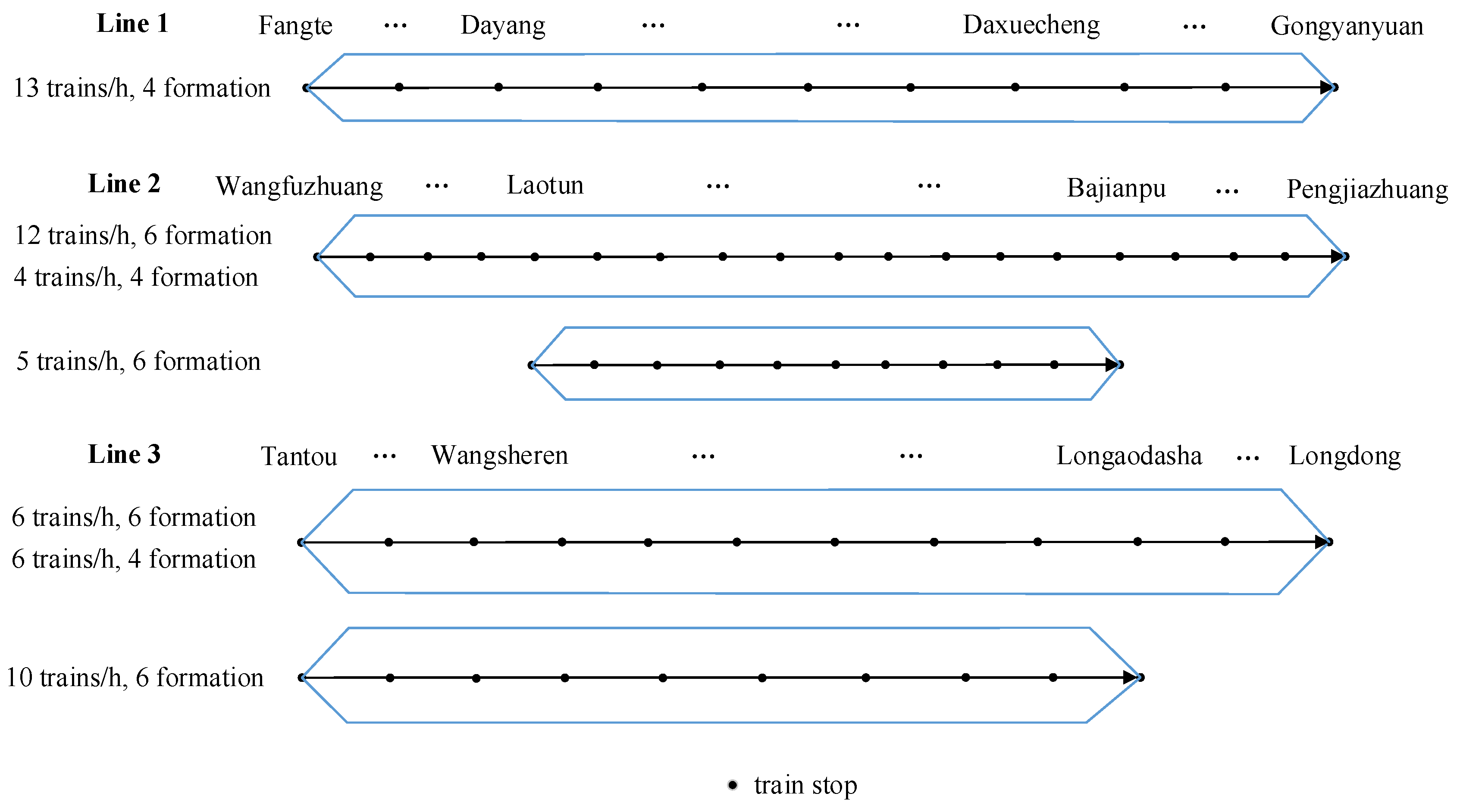 | Long routing model | 13 trains/h, 4 formation | 16 trains/h, 6 formation 5 trains/h, 4 formation | 12 trains/h, 6 formation 12 trains/h, 4 formation |