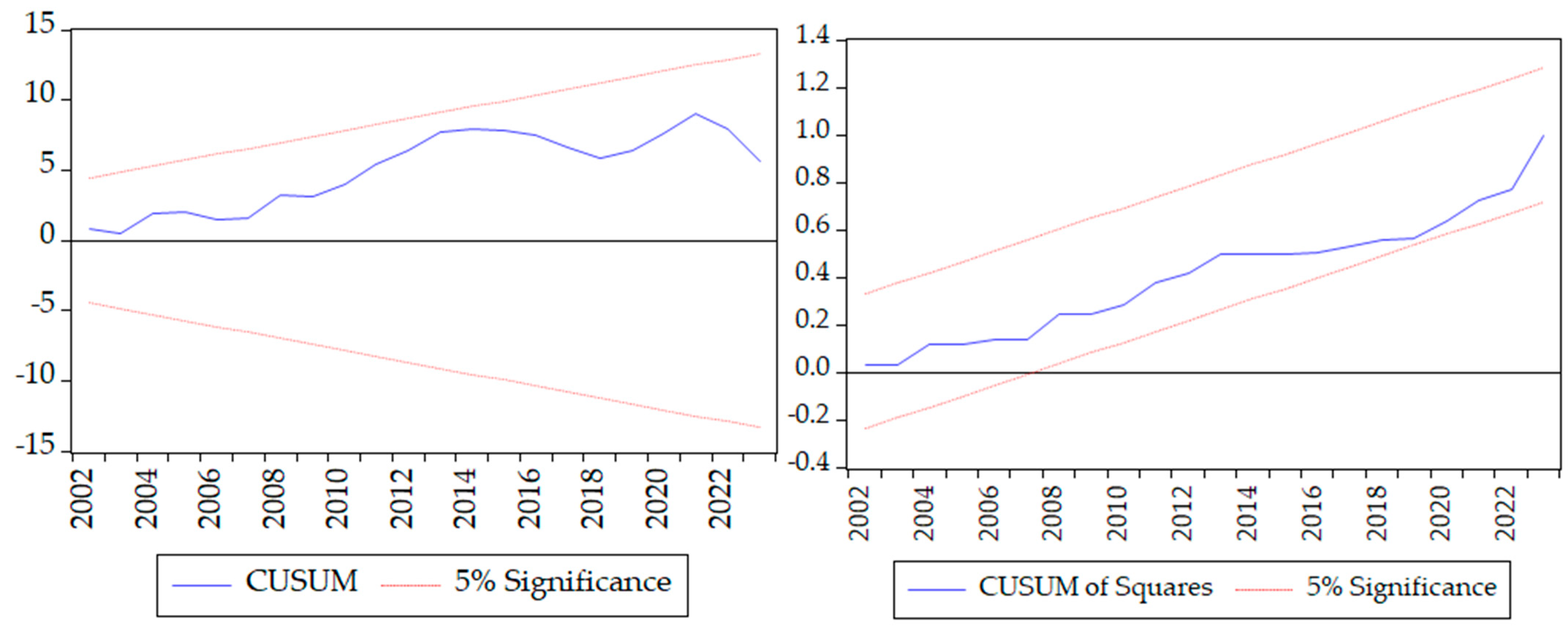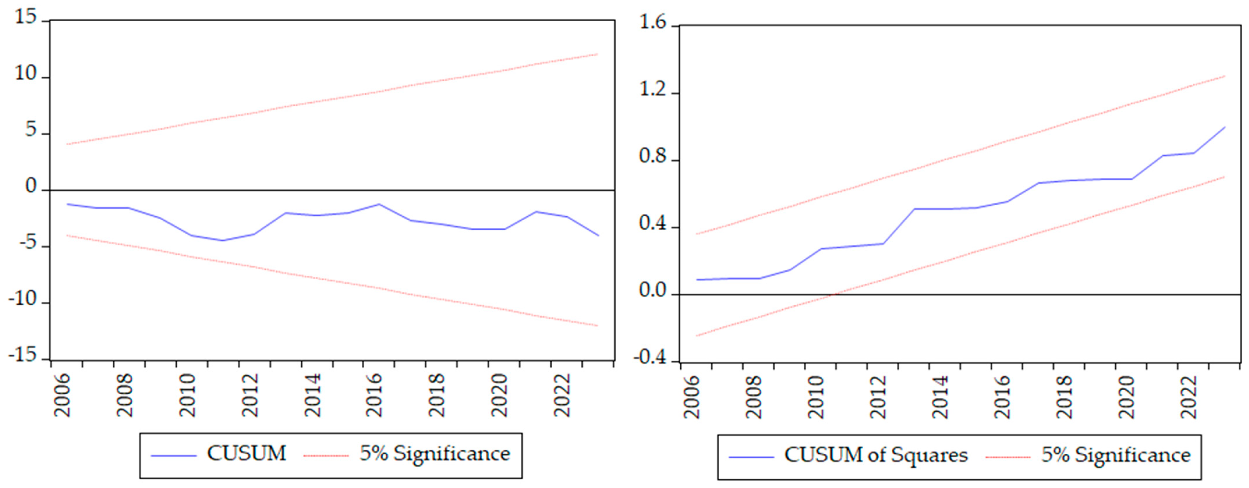 Table 4. The probability value of the Breusch–Godfrey LM test is greater than 0.05, and the null hypothesis of no autocorrelation cannot be rejected. The Breusch–Pagan–Godfrey or ARCH tests also show that there is no heteroscedasticity problem. It is determined that the series is normally distributed, and there is no specification problem in the model because the probability values of Jarque–Bera and Ramsey–Reset tests are above 0.05.