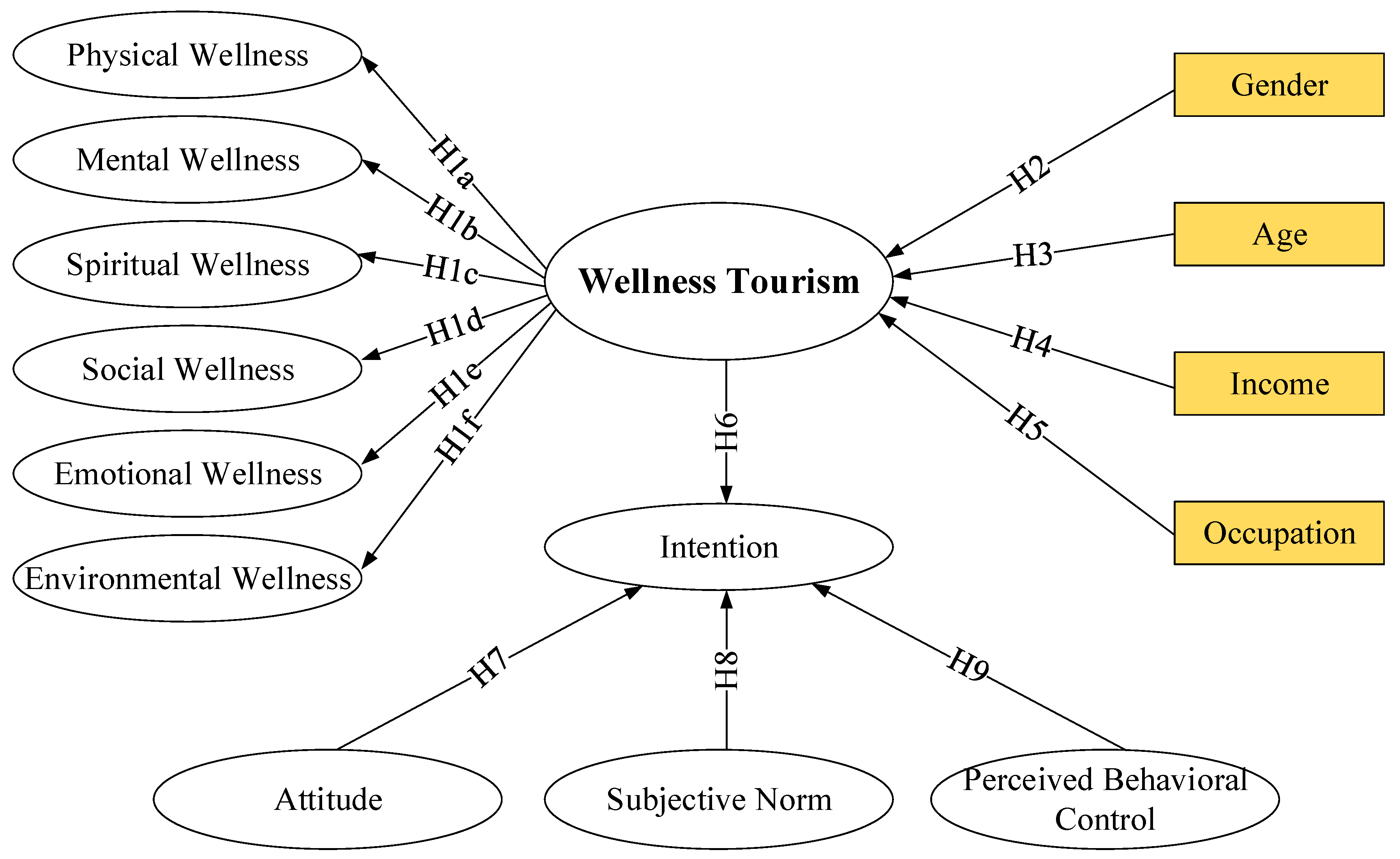 - Do, T.T.; Nguyen, H.N.T. Understanding Gen Y’s Intentions toward Wellness Tourism in Vietnam: A Theory of Planned Behavior Approach. In Routledge Handbook of Tourism and Hospitality Development in Vietnam; Routledge: Oxfordshire, UK, 2025; pp. 296–311. [Google Scholar]