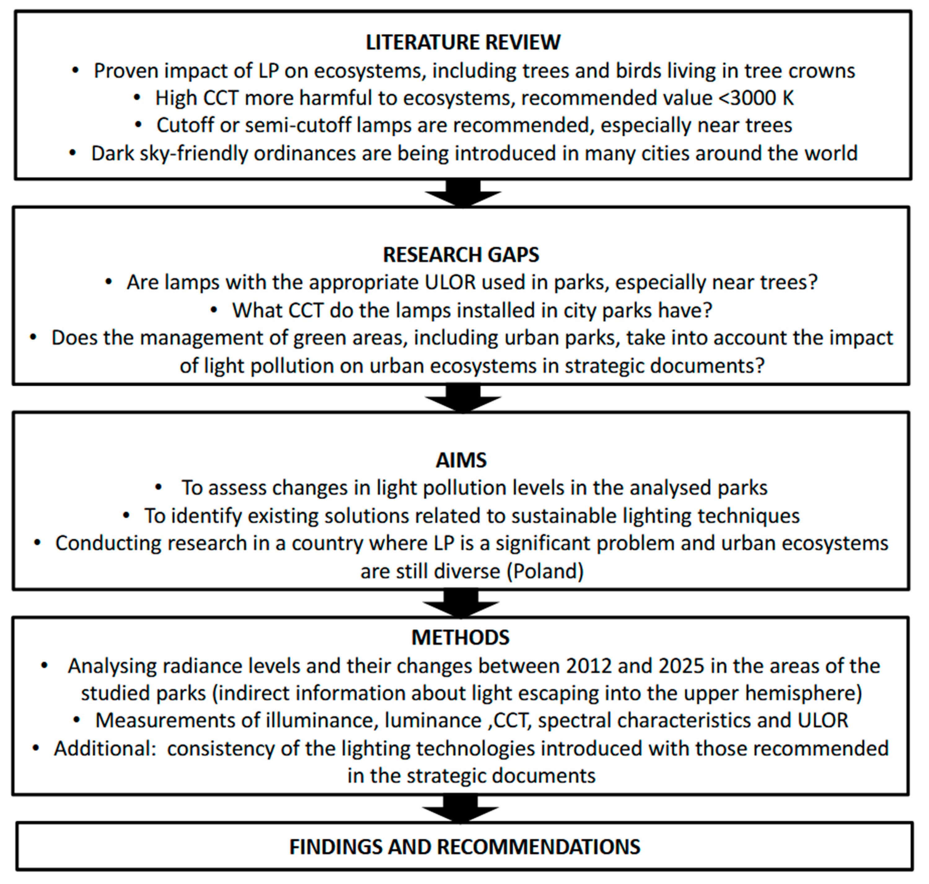 Iwanicki, G.; Ściężor, T.; Tabaka, P.; Kotarba, A.Z.; Kunz, M.; Daab, D.; Kołton, A.; Kołomański, S.; Dłużewska, A.; Skorb, K. Integrating Sustainable Lighting into Urban Green Space Management: A Case Study of Light Pollution in Polish Urban Parks. Sustainability 2025, 17, 7833. https://doi.org/10.3390/su17177833