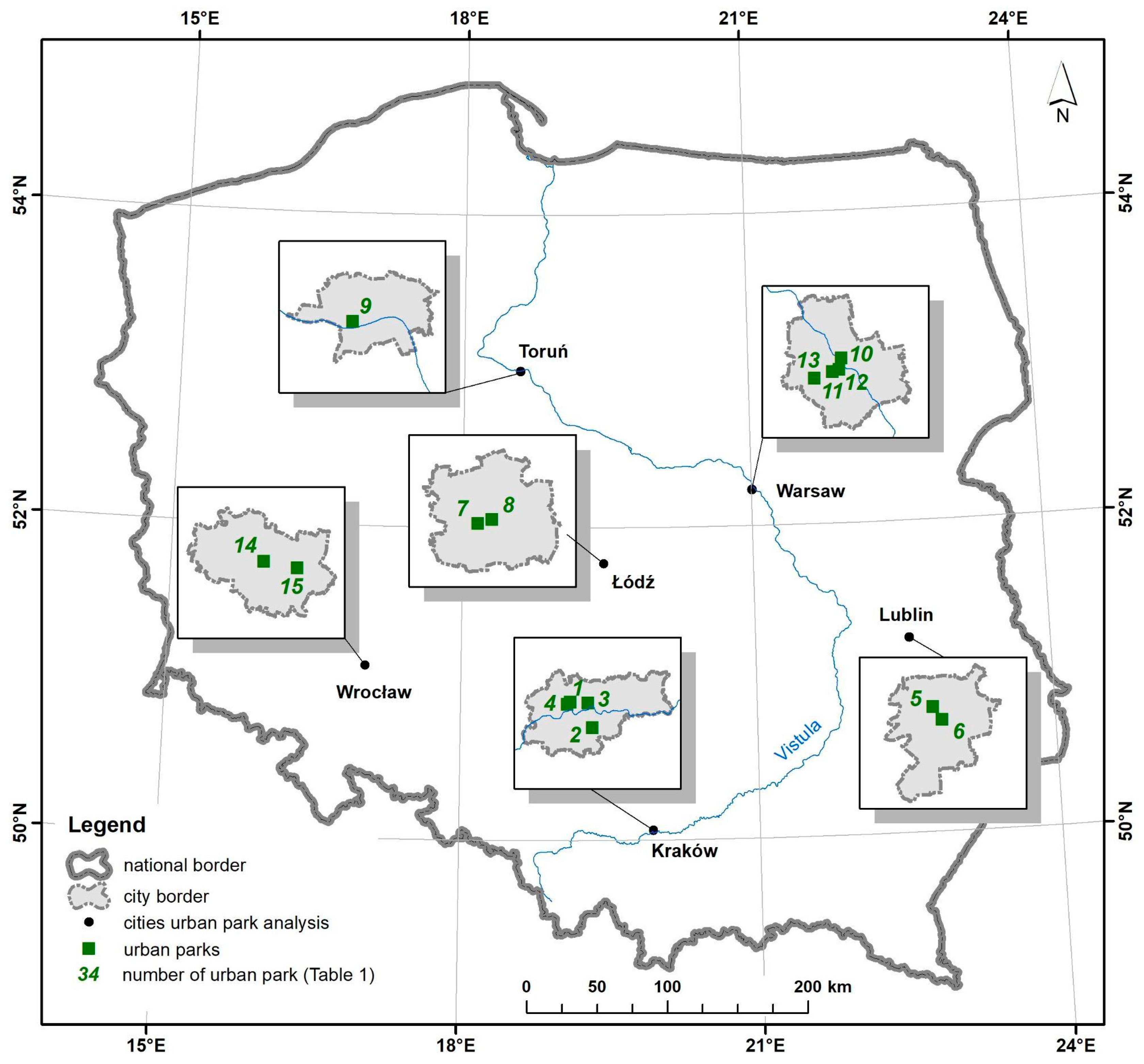 - Wiśniewski, M. Around the Planty Park, Kraków; Urząd Miasta Krakowa: Kraków, Poland, 2017. [Google Scholar]