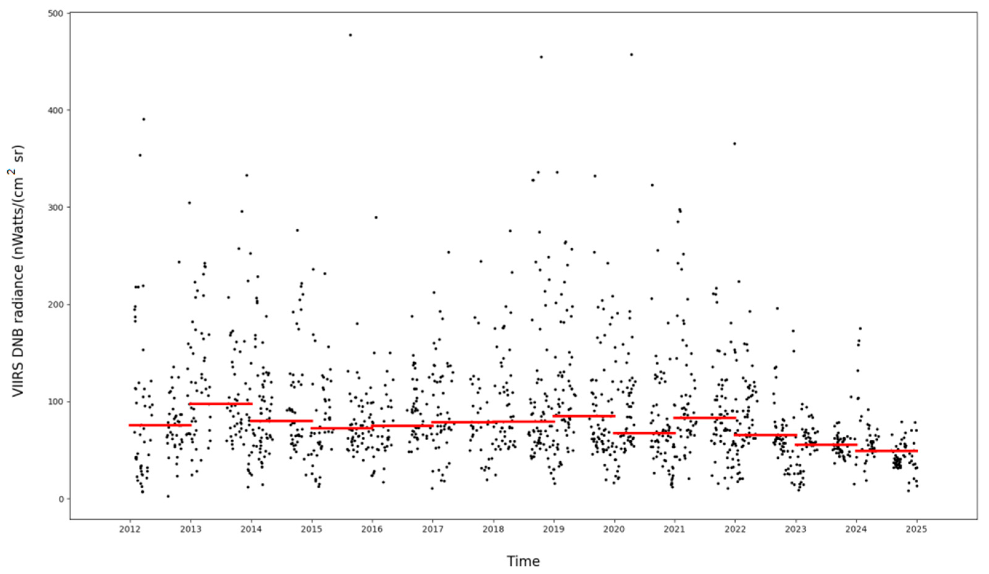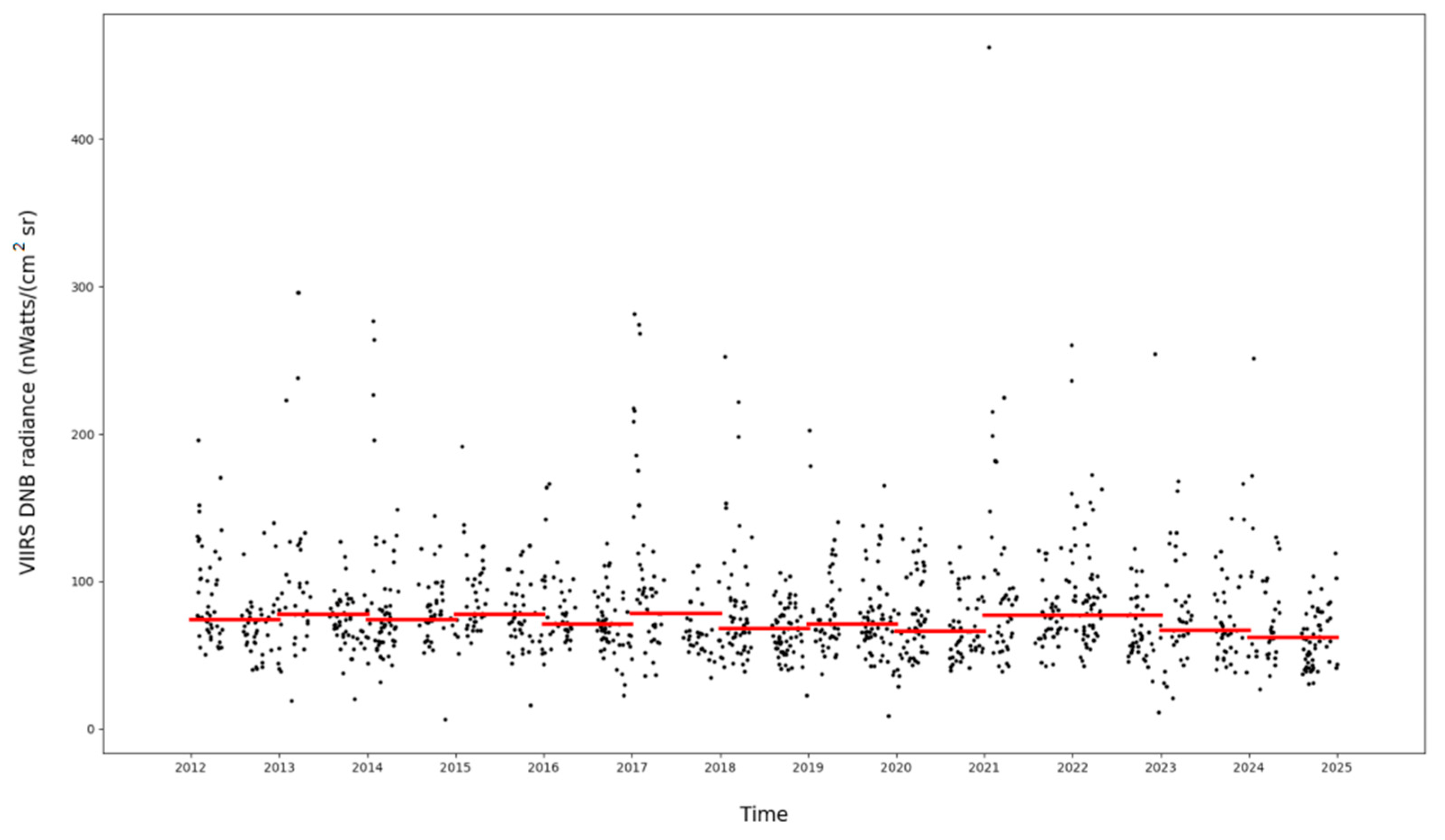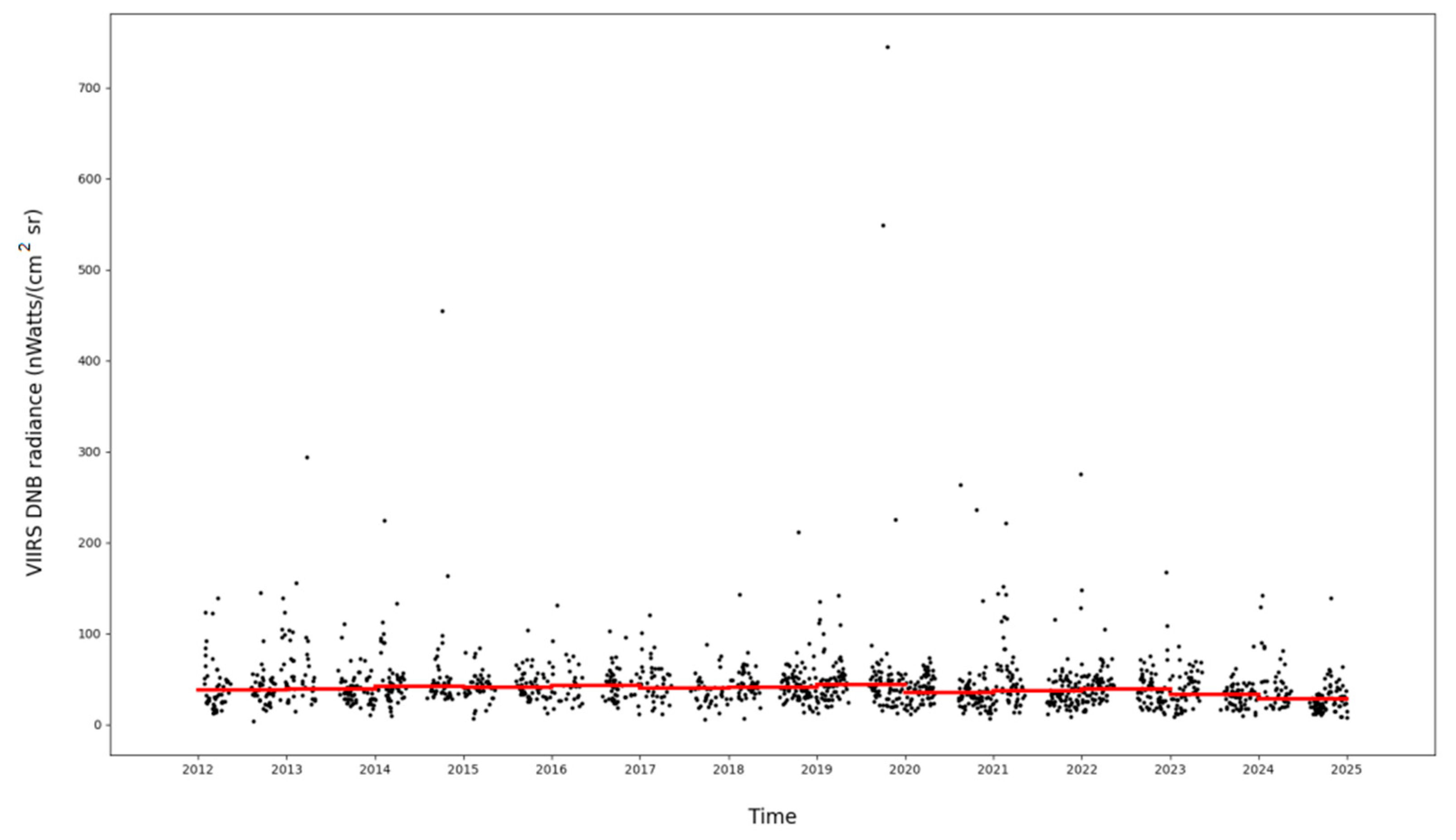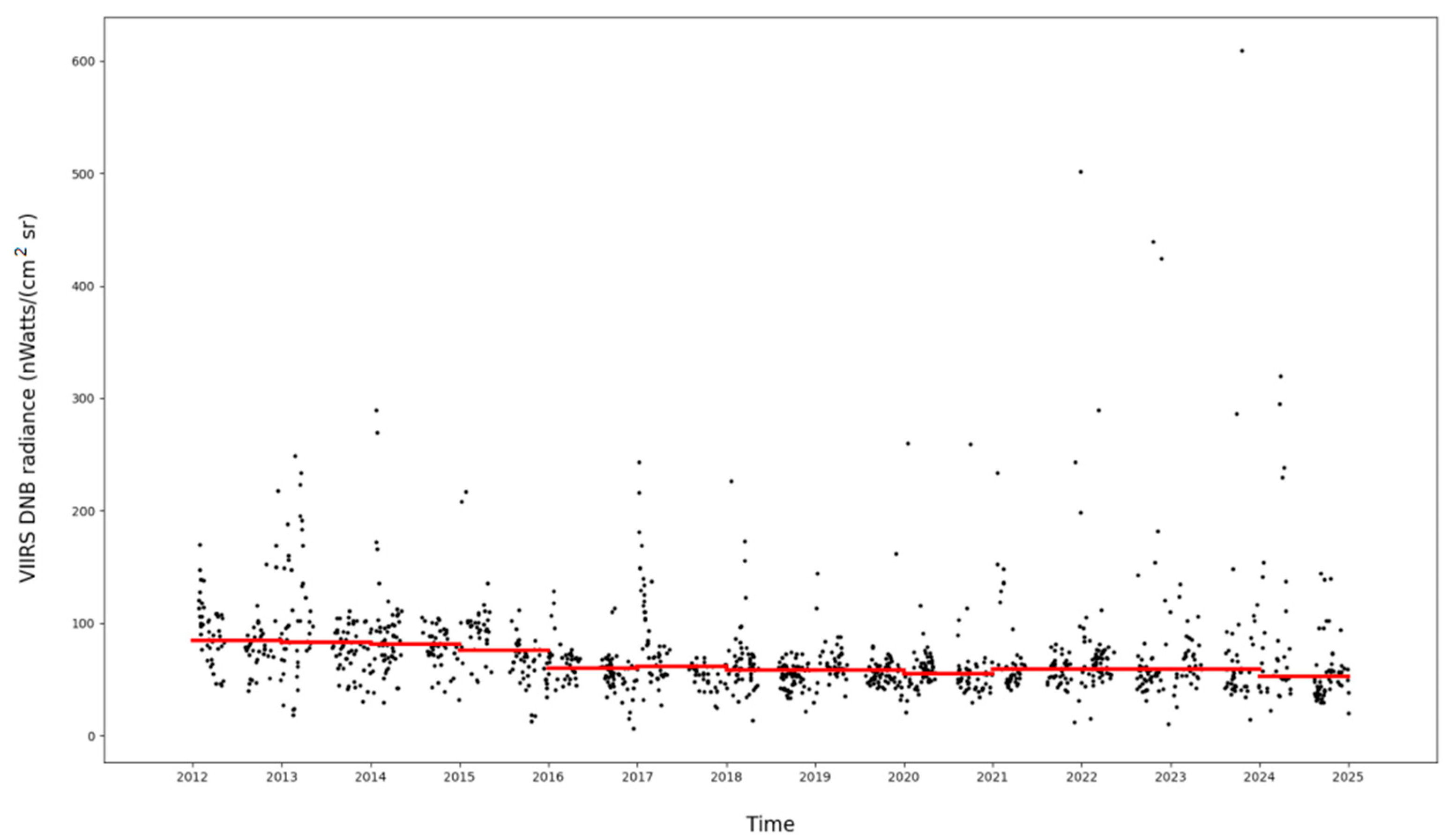 - Kyba, C.C.M.; Kuester, T.; de Miguel, A.S.; Baugh, K.; Jechow, A.; Hölker, F.; Bennie, J.; Elvidge, C.D.; Gaston, K.J.; Guanter, L. Artificially Lit Surface of Earth at Night Increasing in Radiance and Extent. Sci. Adv. 2017, 3, e1701528. [Google Scholar] [CrossRef]