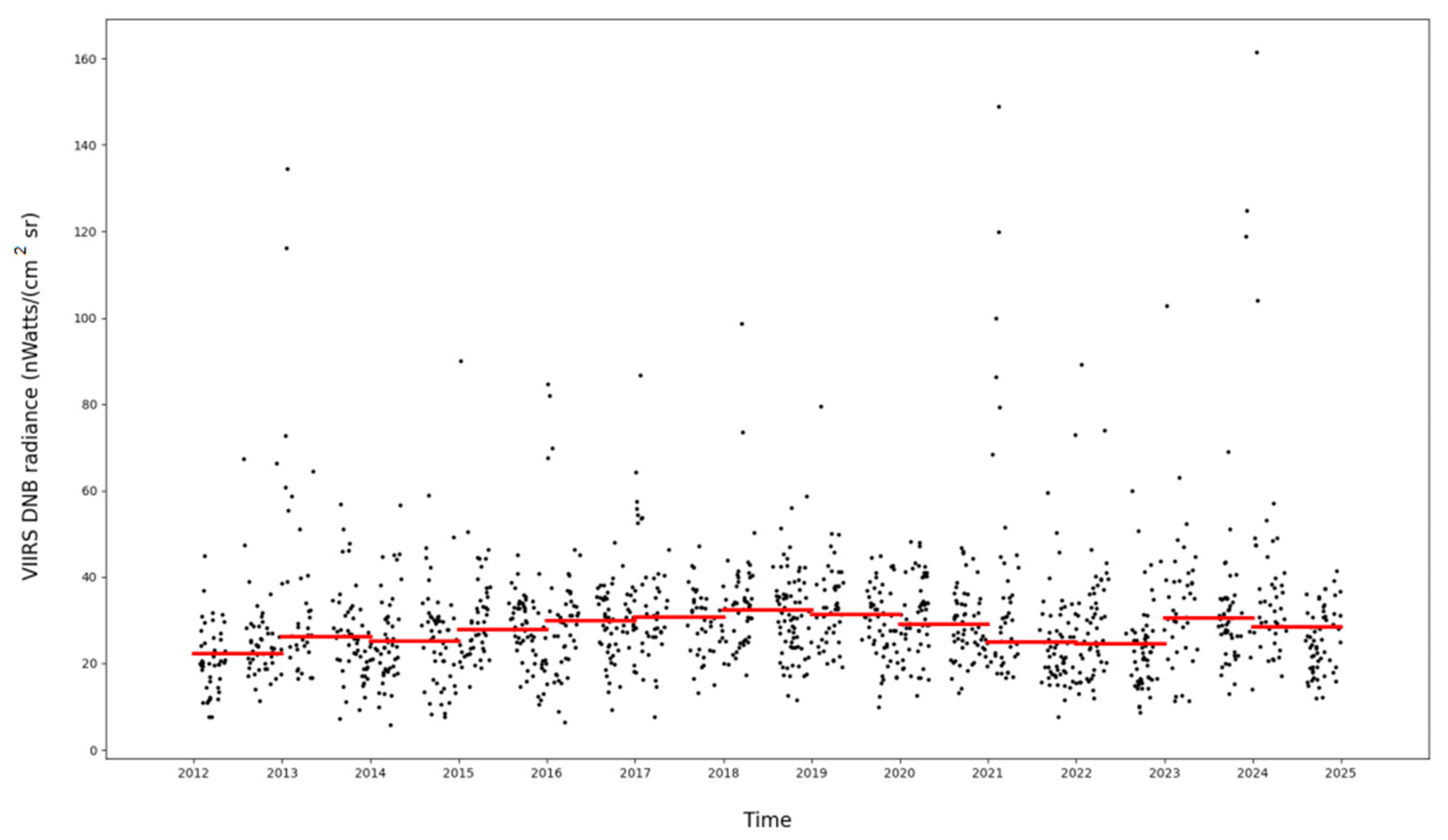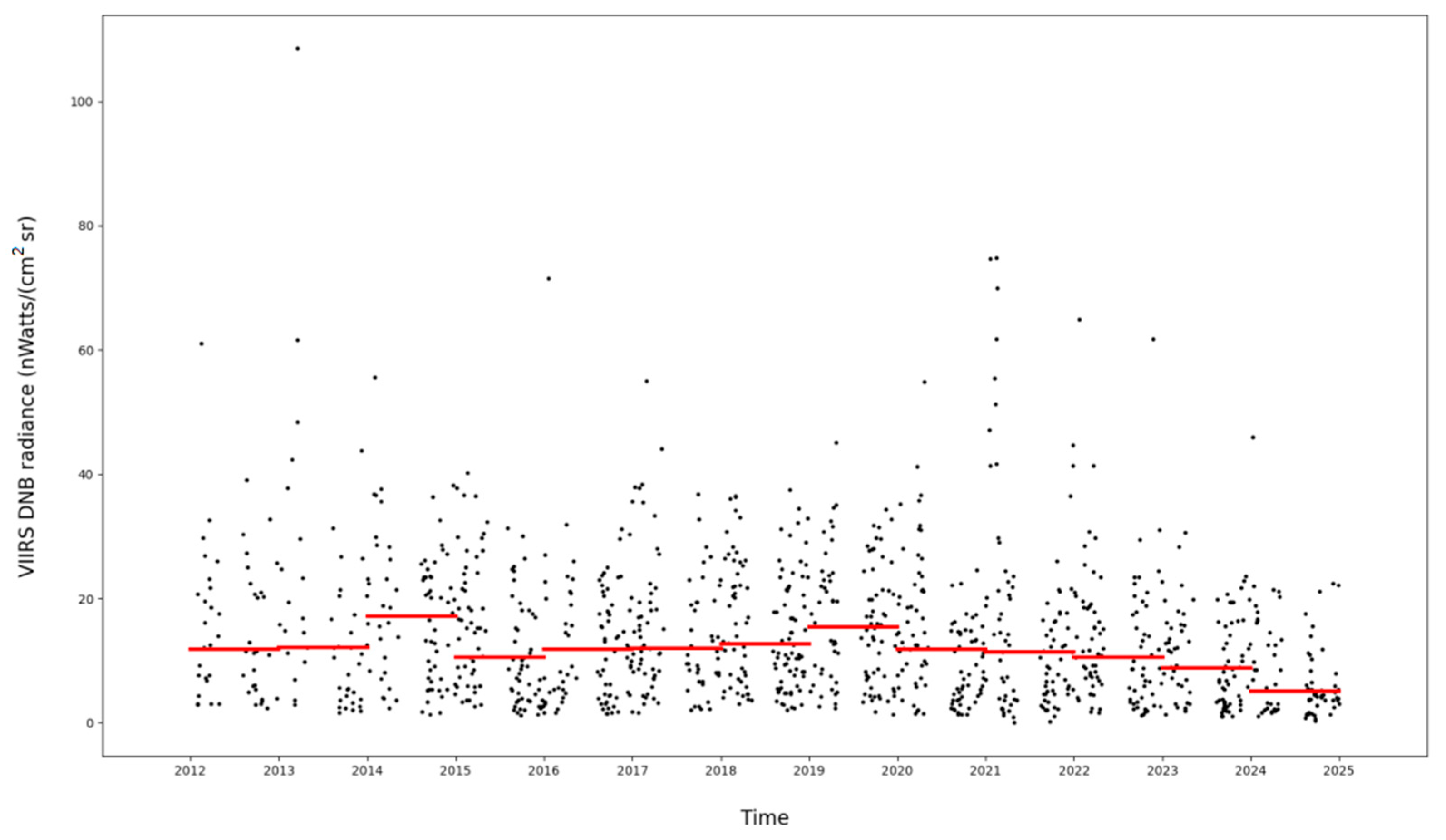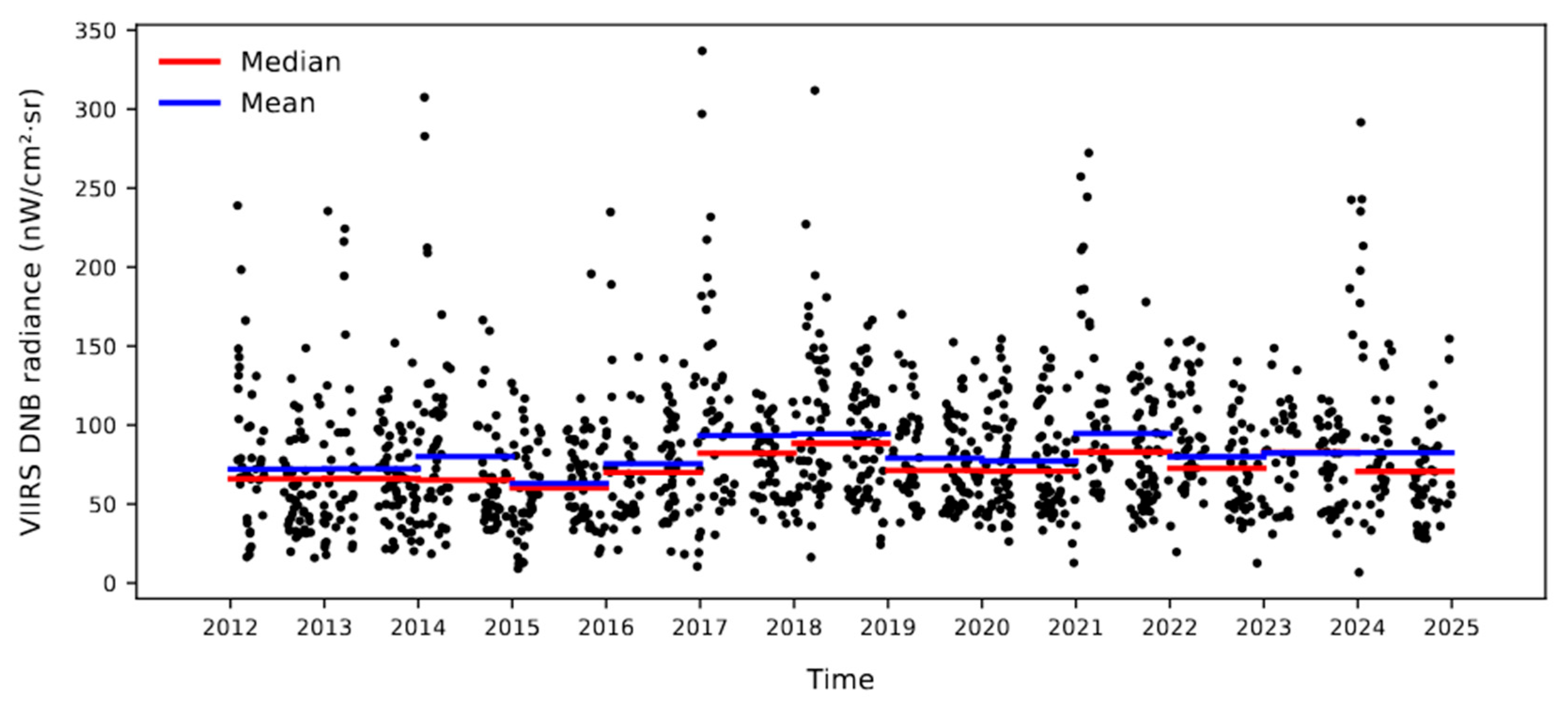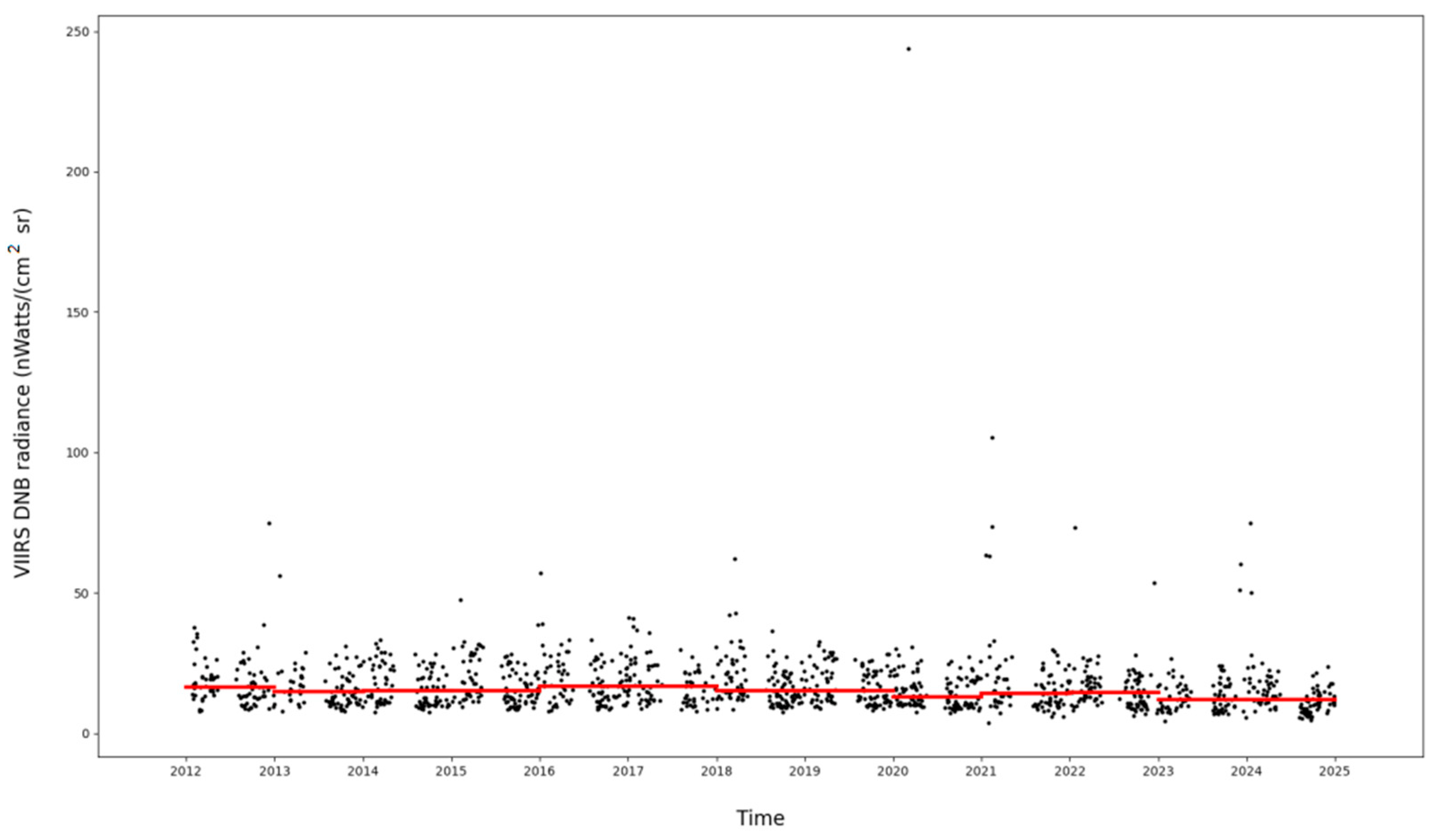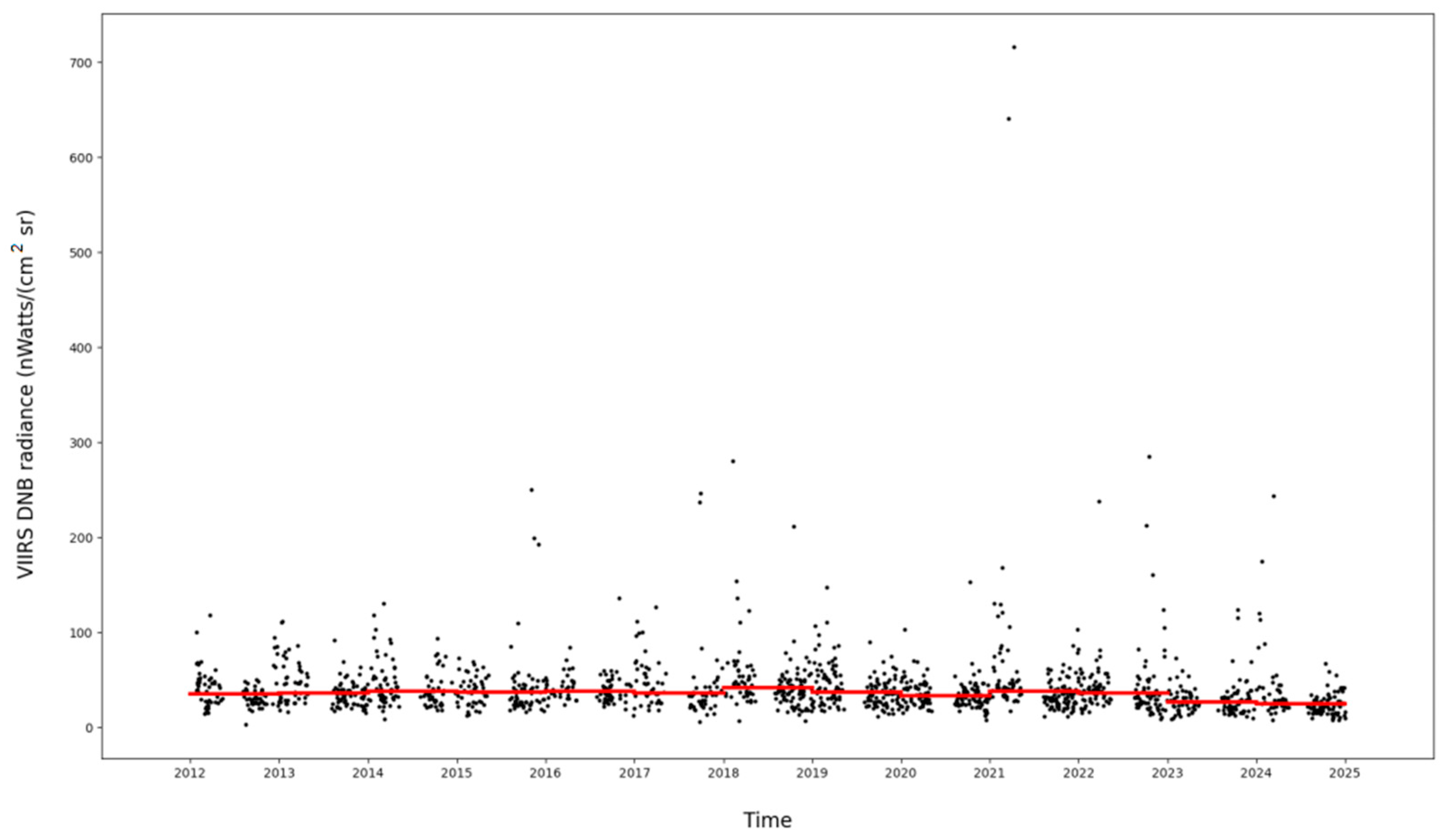 - Kyba, C.C.M.; Kuester, T.; de Miguel, A.S.; Baugh, K.; Jechow, A.; Hölker, F.; Bennie, J.; Elvidge, C.D.; Gaston, K.J.; Guanter, L. Artificially Lit Surface of Earth at Night Increasing in Radiance and Extent. Sci. Adv. 2017, 3, e1701528. [Google Scholar] [CrossRef]
