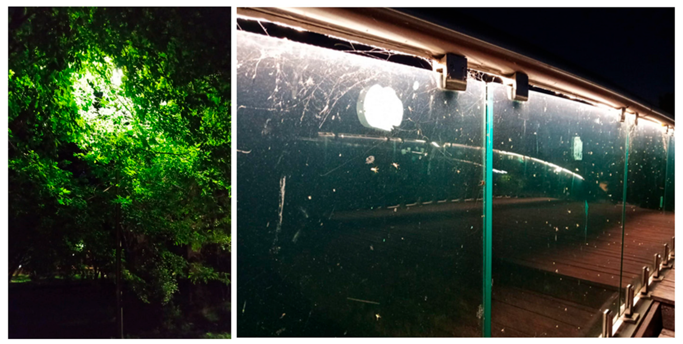 - Supronowicz, R.; Fryc, I. Urban Park Lighting as a Source of Botanical Light Pollution. Photonics Lett. Pol. 2019, 11, 90–92. [Google Scholar] [CrossRef]
