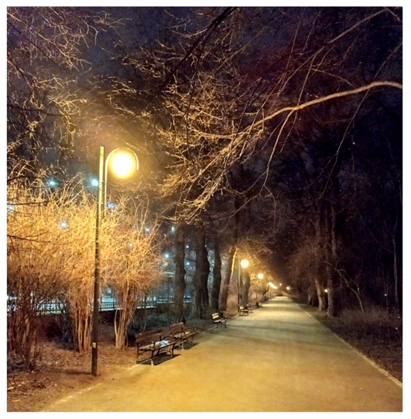 - Lis, A.; Zienowicz, M.; Kącki, Z.; Iwankowski, P.; Kukowska, D.; Shestak, V. Park lighting after dark–is it a route or a place? How people feel in park nightscapes (experiment). Landsc. Urban Plan. 2024, 248, 105098. [Google Scholar] [CrossRef]