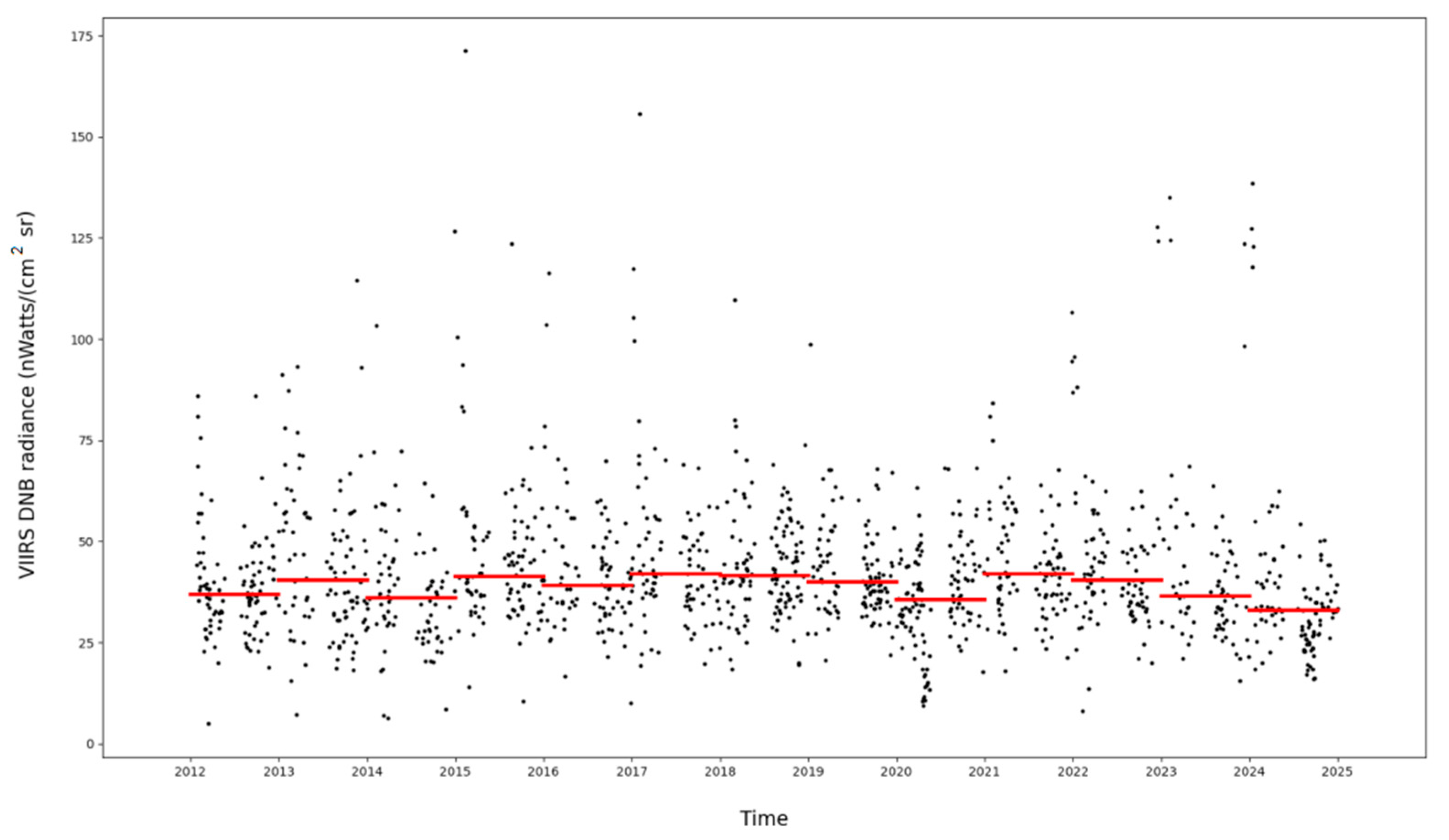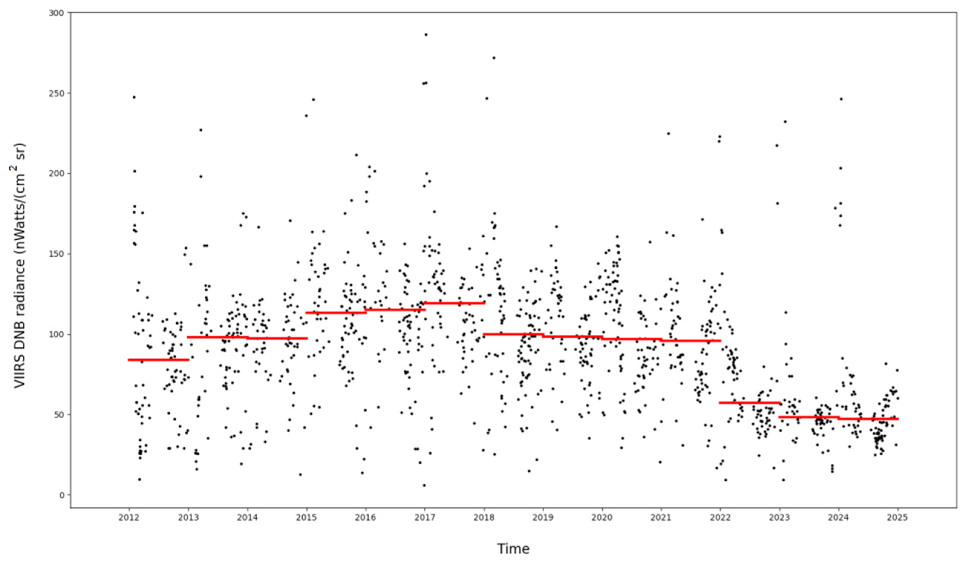 - Román, M.O.; Wang, Z.; Sun, Q.; Kalb, V.; Miller, S.D.; Molthan, A.; Schultz, L.; Bell, J.; Stokes, E.C.; Pandey, B.; et al. NASA’s Black Marble nighttime lights product suite. Remote Sens. Environ. 2018, 210, 113–143. [Google Scholar] [CrossRef]