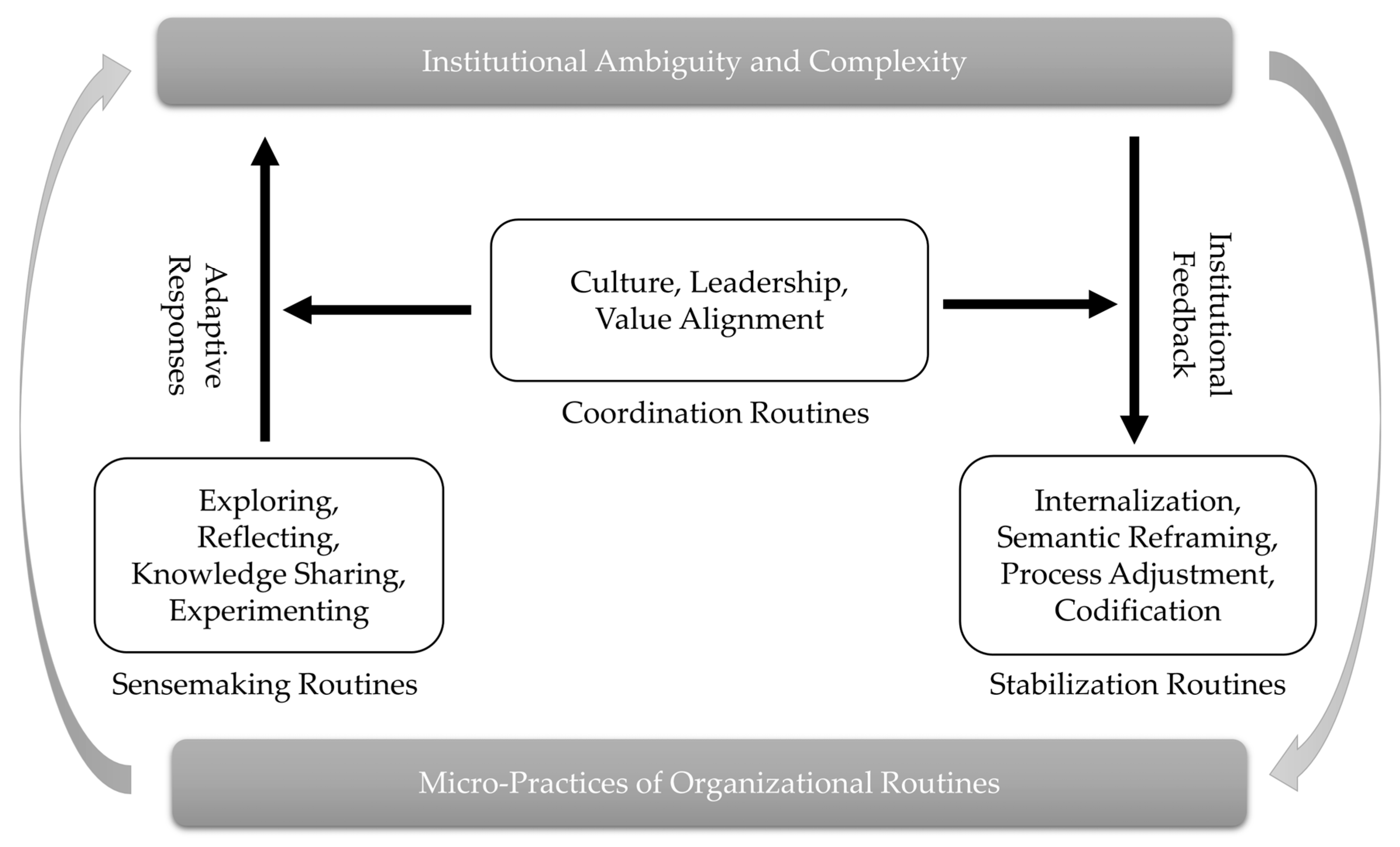 - Feedback-driven contextual reframing: Each enacted routine generates interpretive residues that alter the actor’s subsequent sensemaking and institutional expectations.