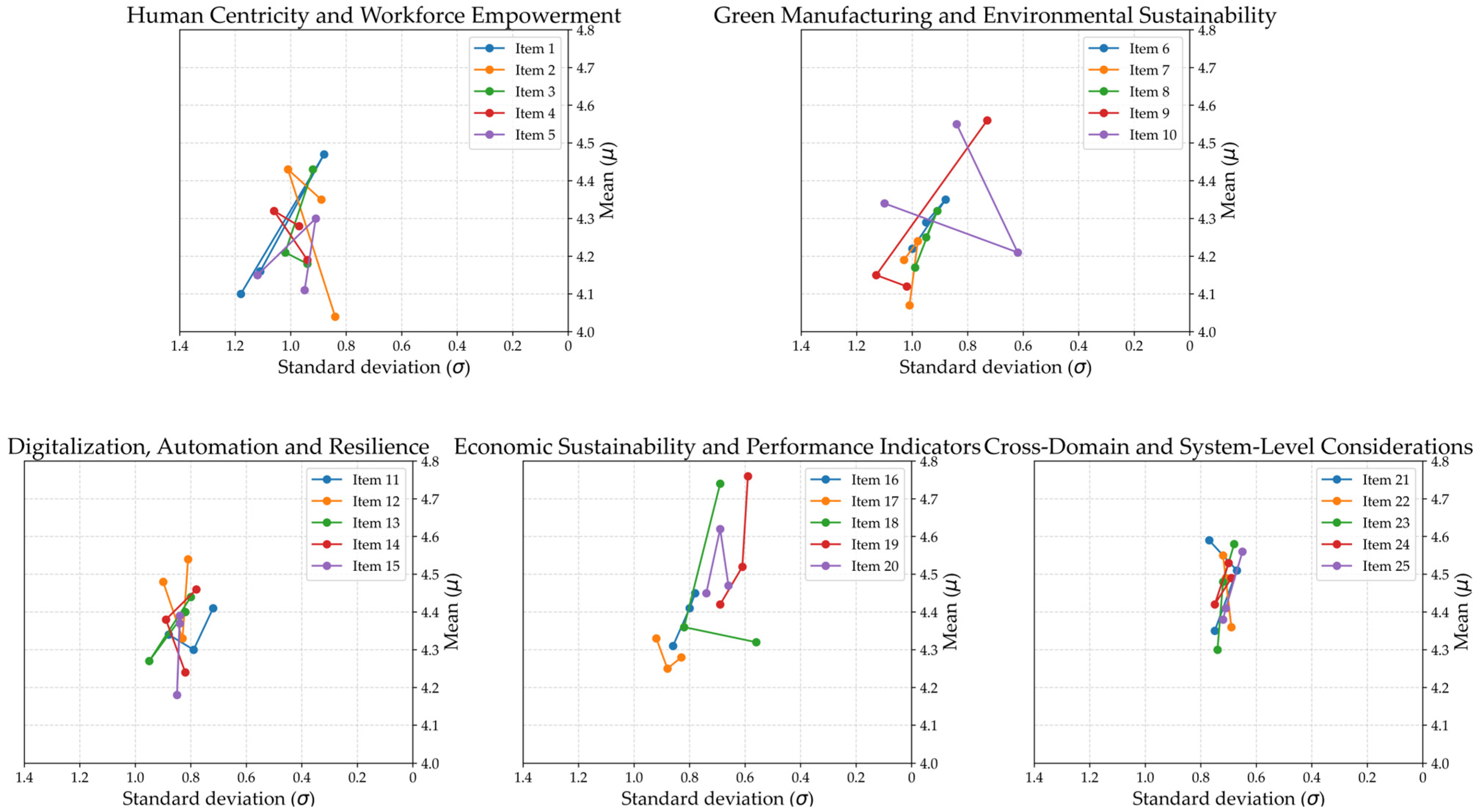 23 | Human-centric design and ethical AI governance are the prerequisites for Industry 5.0’s responsible implementation. | 4.32, 0.91, 1.12, 0.68 | 4.45, 0.78, 0.90, 0.75 | 4.56, 0.65, 0.60, 0.83 |