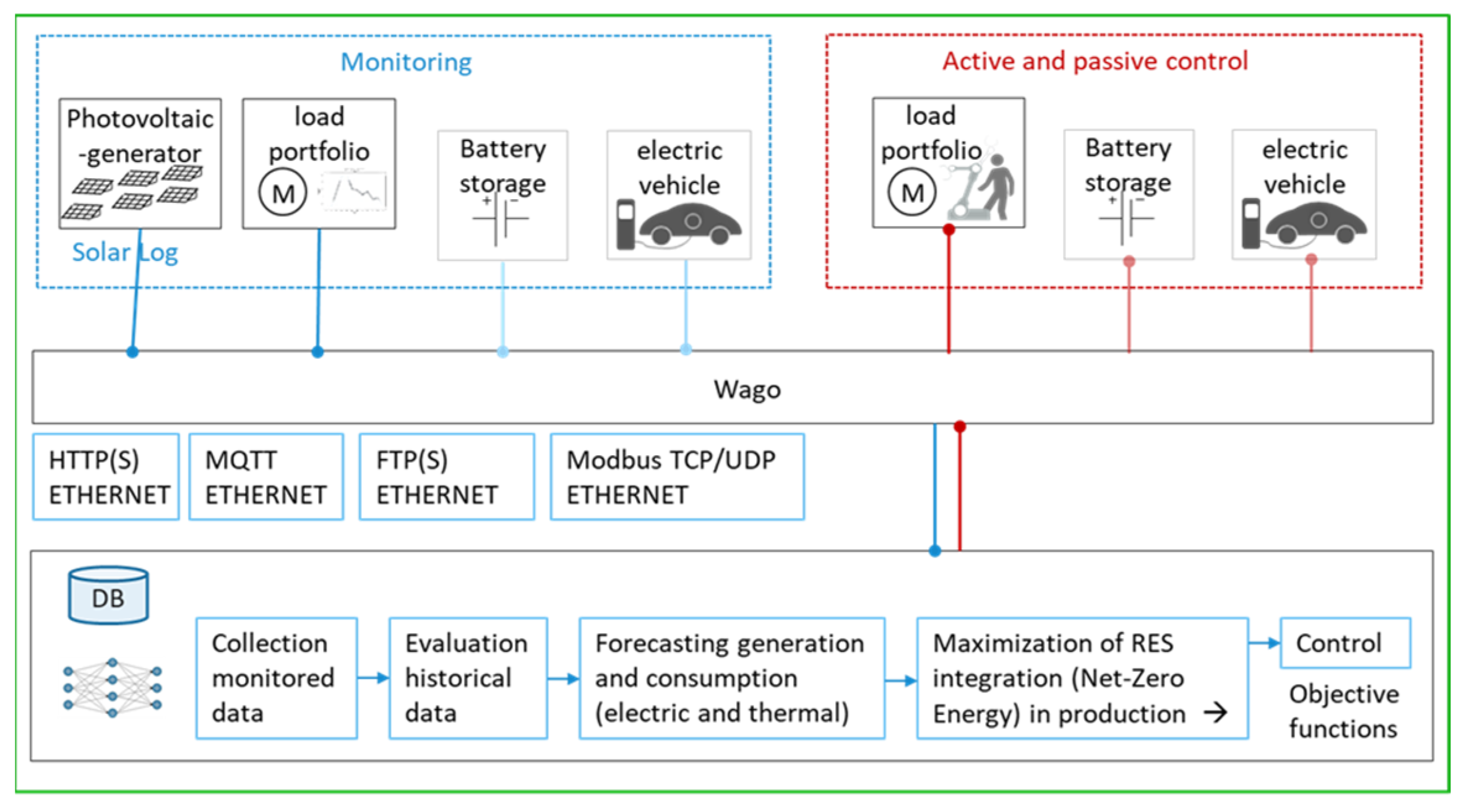 - Monitoring layer: This layer is responsible for continuously collecting and analyzing data from key energy-related components of the factory, including the PV system, load portfolio (sawing, drilling, milling, sanding), battery storage, and electric vehicle charging stations. Smart meters are used to monitor the real-time energy consumption, while the Solar-Log system records the PV generation. Data from all devices are transmitted through various communication protocols—HTTP(S), MQTT, file transfer protocol secure (FTP(S)), and Modbus transmission control protocol/user datagram protocol (TCP/UDP)—and stored in a centralized database. The data are analyzed to evaluate historical trends, forecast future energy generation and consumption (both electric and thermal), and support decision-making processes.