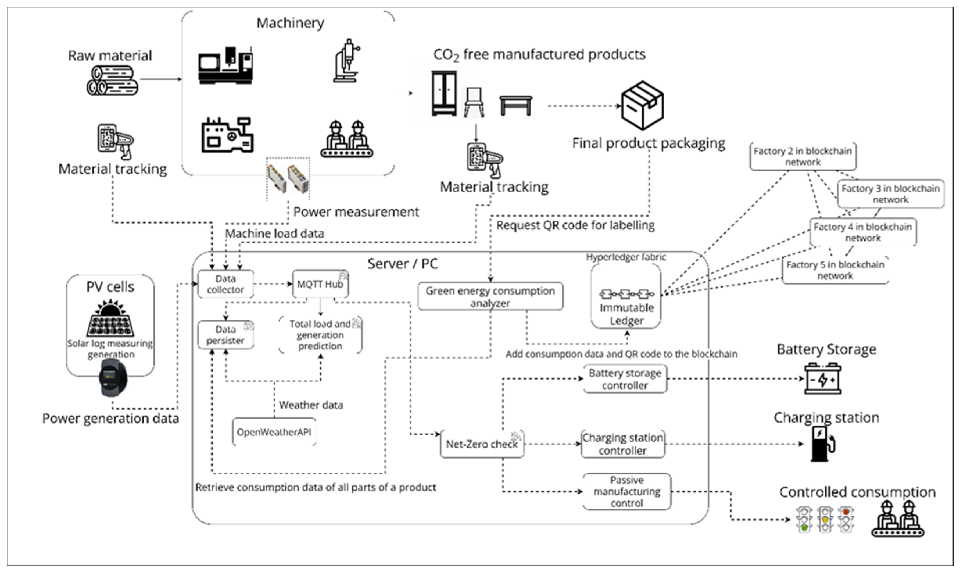 - Sensorics: Involving devices to measure energy and material flows within the facility, as well as parameters such as wind speed, solar irradiation, ambient temperature, room temperature, and the rotating speed of machines.