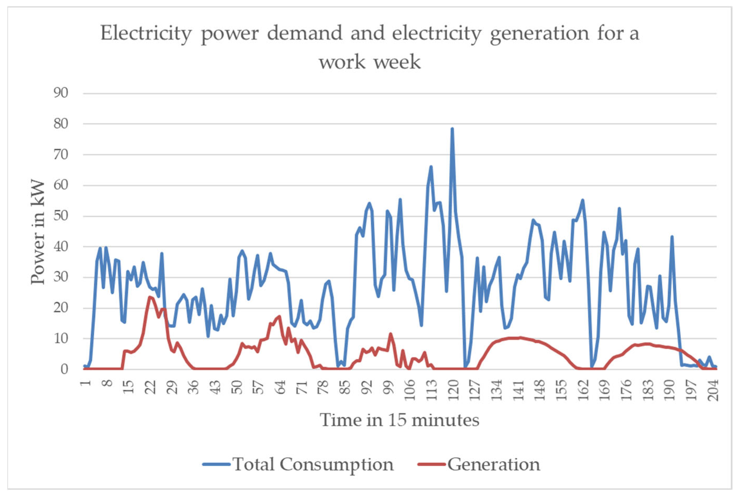 - Process flexibility: The carpentry factory can shift ≈30 kW for ≈3 h or ≈10 kW for ≈8 h (about 30% of peak load). Peak power is 80–100 kW; most operations last for <300 s (about 2 kWh for sawing; 2–3 kWh for banding). This enables better matching with on-site PV without affecting throughput.