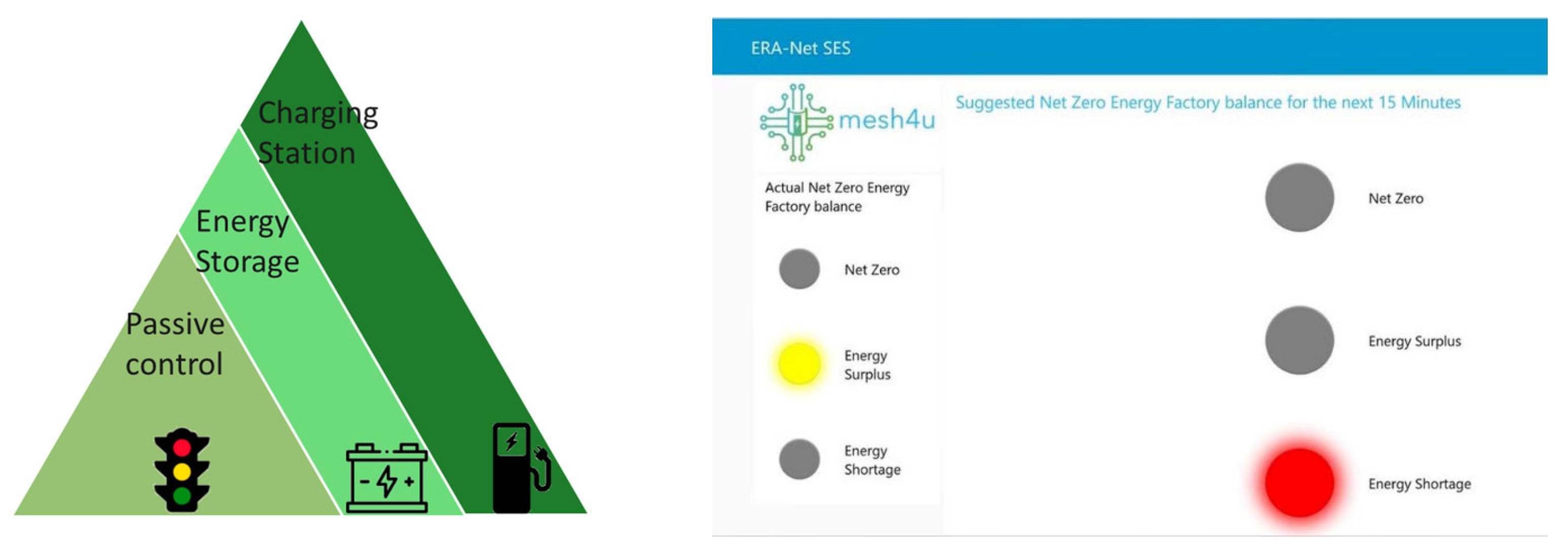 - Active and passive control layer: This layer uses the data collected by the monitoring system to implement control strategies that optimize energy consumption. Passive control provides machine operators with real-time visual feedback (e.g., traffic light signals) to guide process adjustments during periods of high solar power generation. If the suggested adjustments are not made, active control intervenes to manage battery storage and electric vehicle charging, ensuring maximum integration of the renewable energy into the production process.