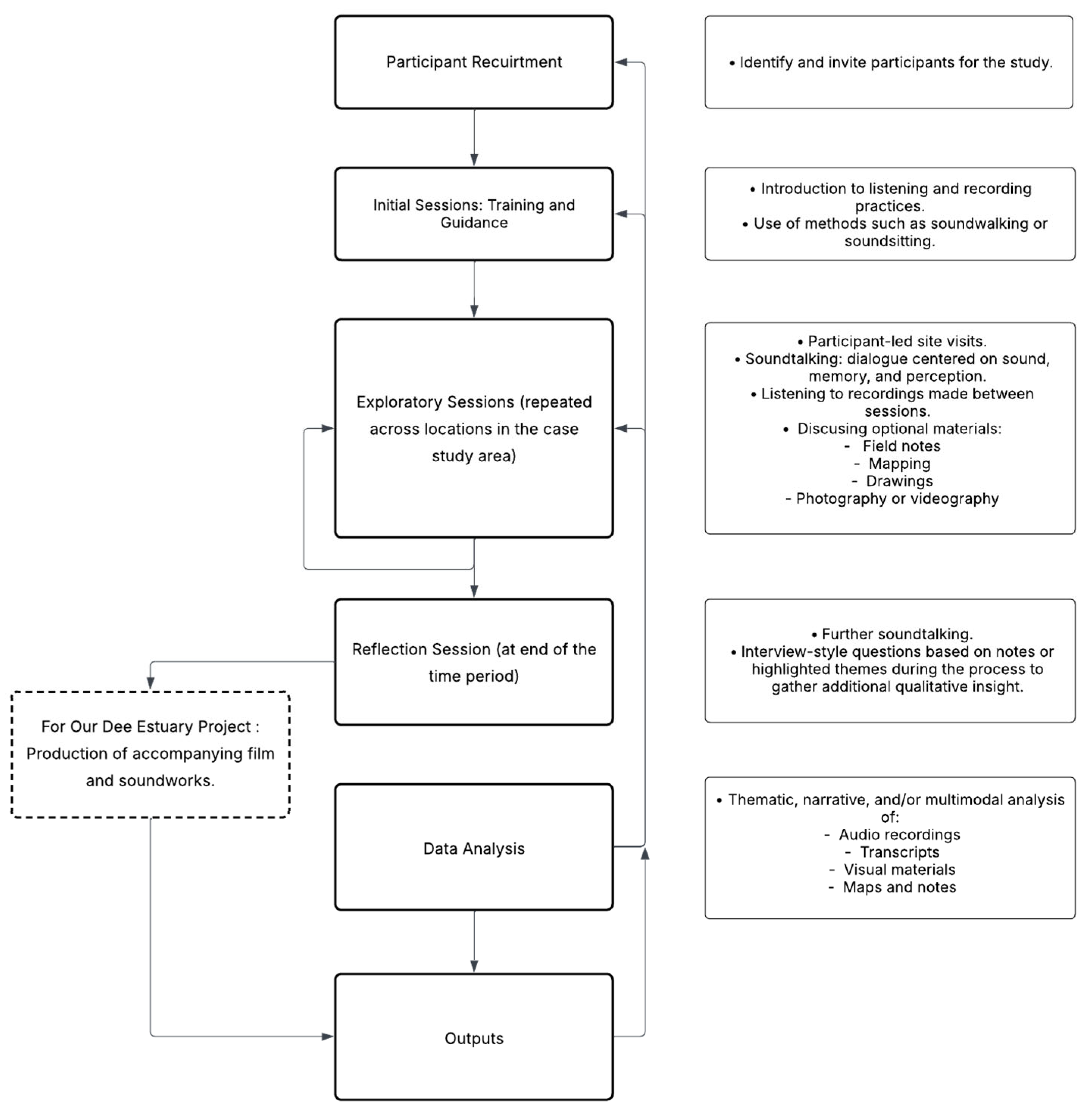 10], exploring ecological awareness and collective environmental responsibility. The Our Dee Estuary project, a community-engaged soundscape initiative in the Dee Estuary region of the United Kingdom, funded through a National Lottery Grant, was led by a collaboration between the Our Dee Estuary, Cheshire Wildlife Trust, and academic researchers from the University of Liverpool, the University of Manchester, and Manchester Metropolitan University. The initial aims of this project package were to reject deficit-based models of environmental education that position local communities as passive recipients of expert knowledge and to attempt instead to foreground the everyday experiences, cultural memories, and tacit knowledges embedded within the local environment of the Dee Estuary. The initial project set out to examine how storytelling, memory-sharing, and place-based dialogue contribute to more relational and affective understandings of the estuary and its soundscape, through field recording practice and other soundscape methods. Although the project was initially situated as an ethnographic study, where sound would form the catalyst for exploration, engagement, and documentation of the estuarial environment, it was through a practice-based research approach explored by the author that led to the development of this method. The author was brought on to the project to facilitate the soundscape and field recording elements of the project and provide their sound and acoustic expertise to a larger study; however, it was through the initial application of traditional methodologies that permitted knowledge to emerge about participant process, embodiment, and engagement, which led to the conceptualisation of