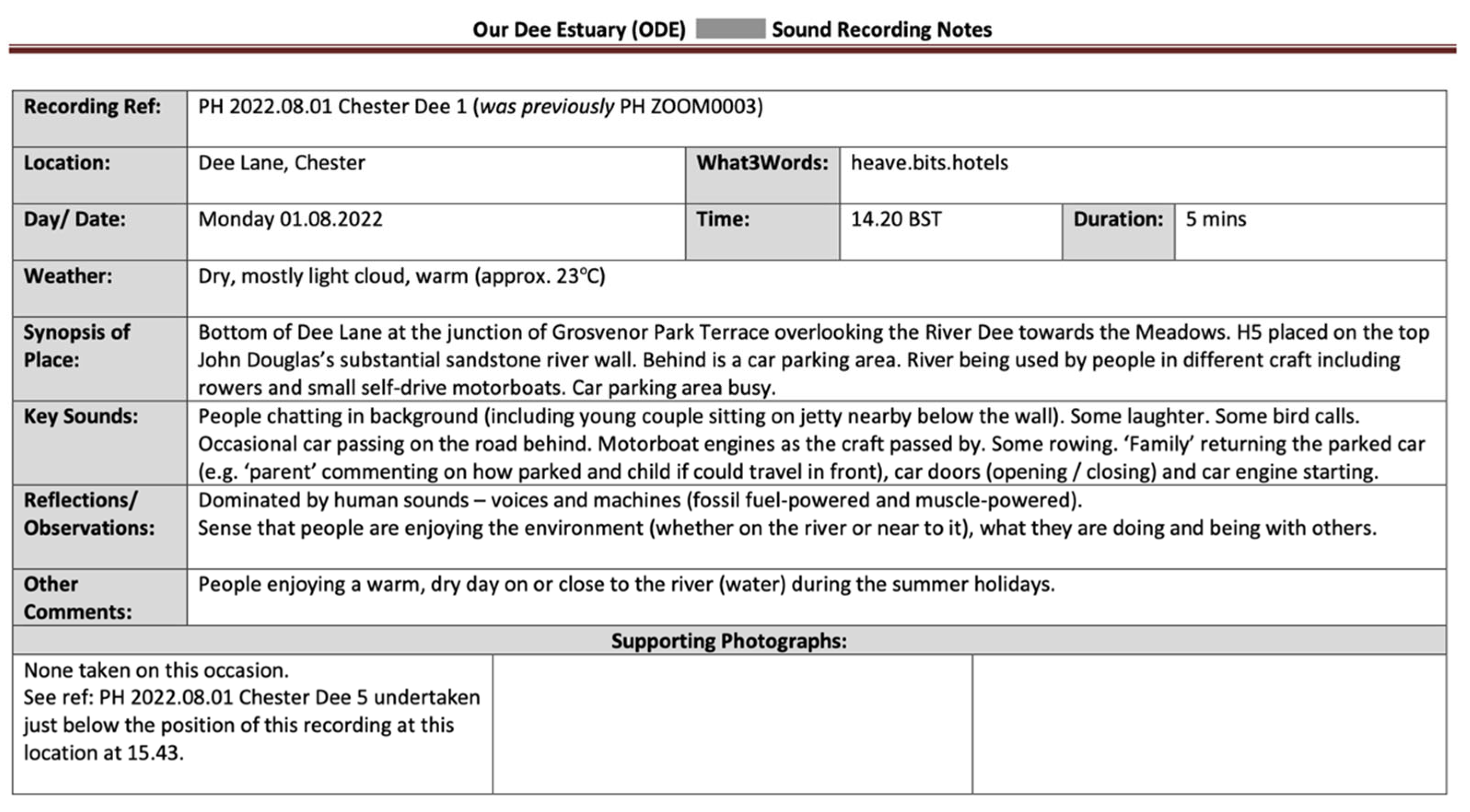 Figure 4, which shows the sound diary that one of the participants created. Such dialogues also reveal local knowledge and values: a seemingly unimportant sound being tied to a community’s identity or history, such as the relationship between local mud larkers and the RSPB in the case of the Dee. It can be through one participant’s story, which brings to light new learning and experiences to the group, uncovering the cultural meanings of soundscapes, or when thinking about the historical importance of the environment, for example, thinking about how the estuary has transformed and been shaped since the Roman period.