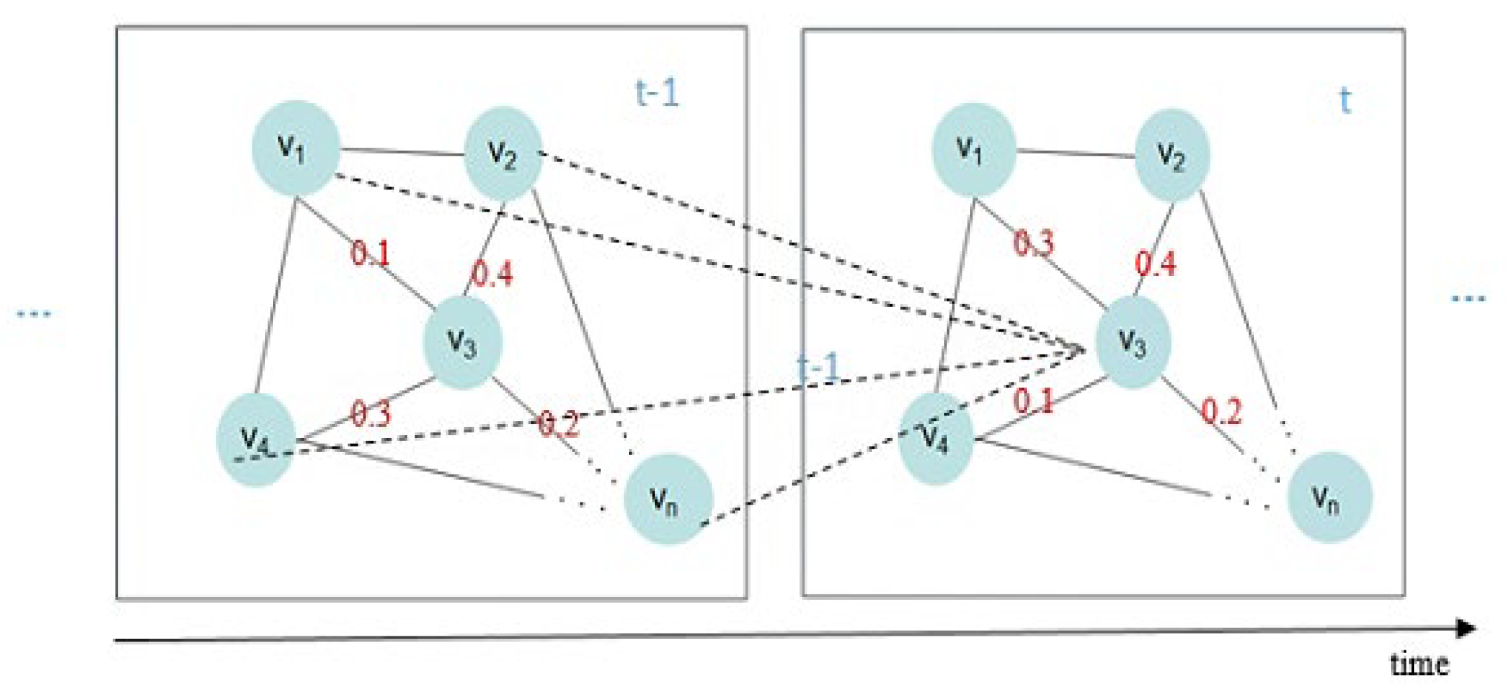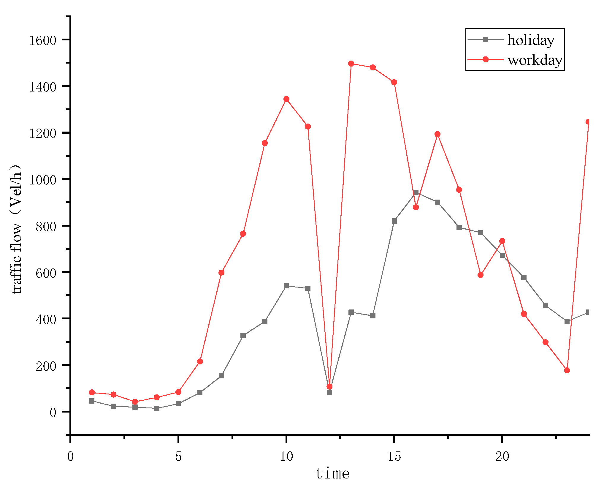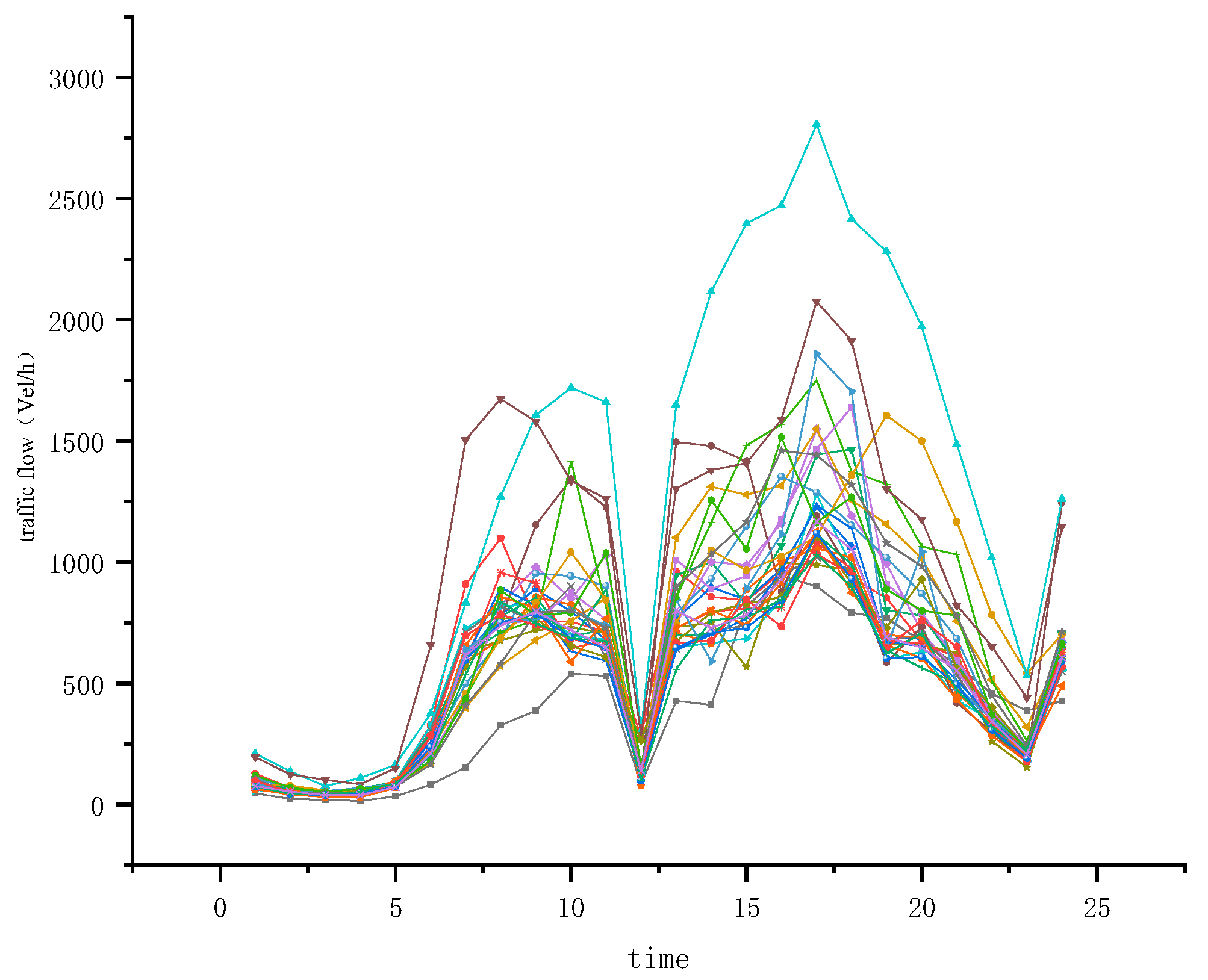 - Adjacent temporal feature (time): The situation in which the current predicted period of traffic volume data in the stable change pattern of traffic flow at highway stations is affected by the adjacent previous period or periods. That is capturing the impact of the predicted time t.