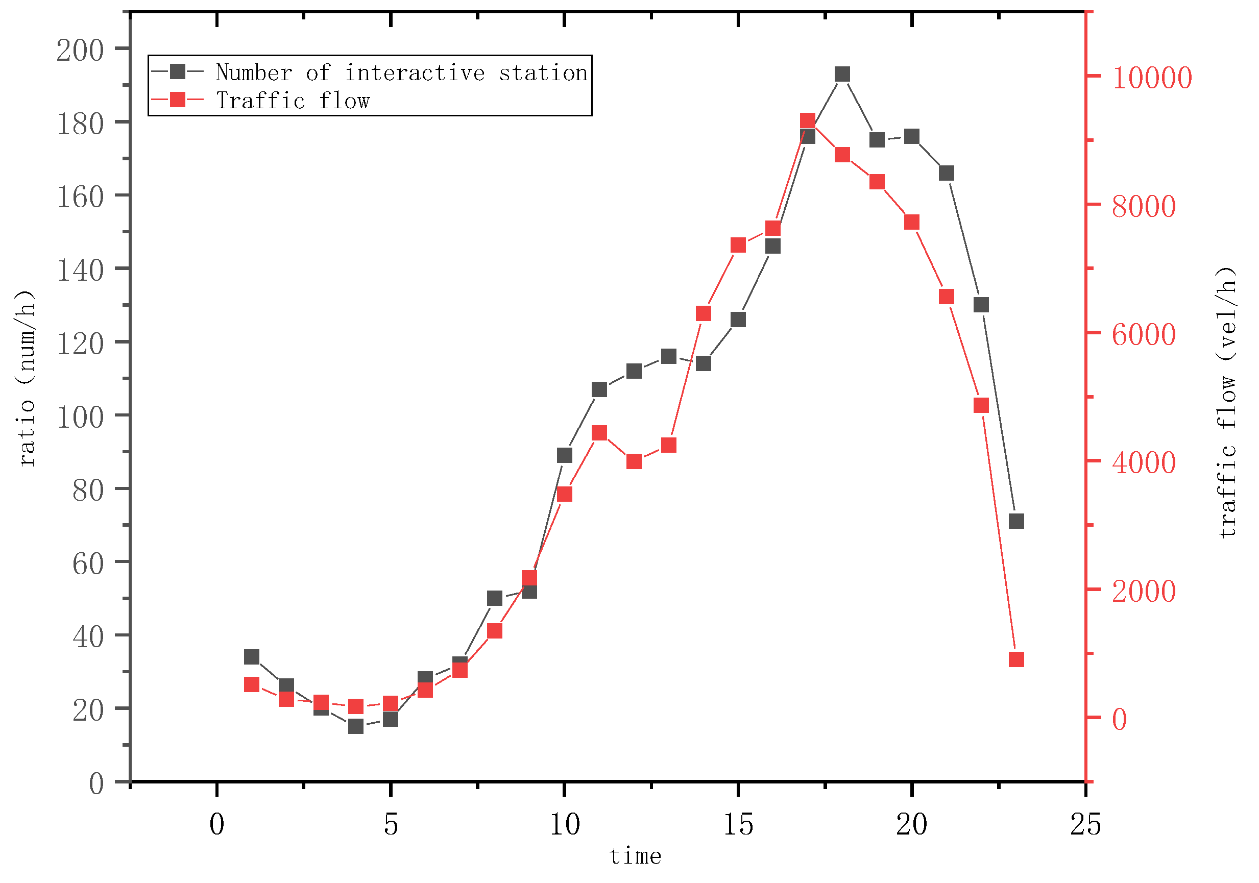 - Trend temporal characteristics (days): Station traffic flow has a similar trend of change every 24 h, such as the appearance of morning and evening peaks at similar times, and the trend of change between peak and off peak is similar. Capture the degree impact of .