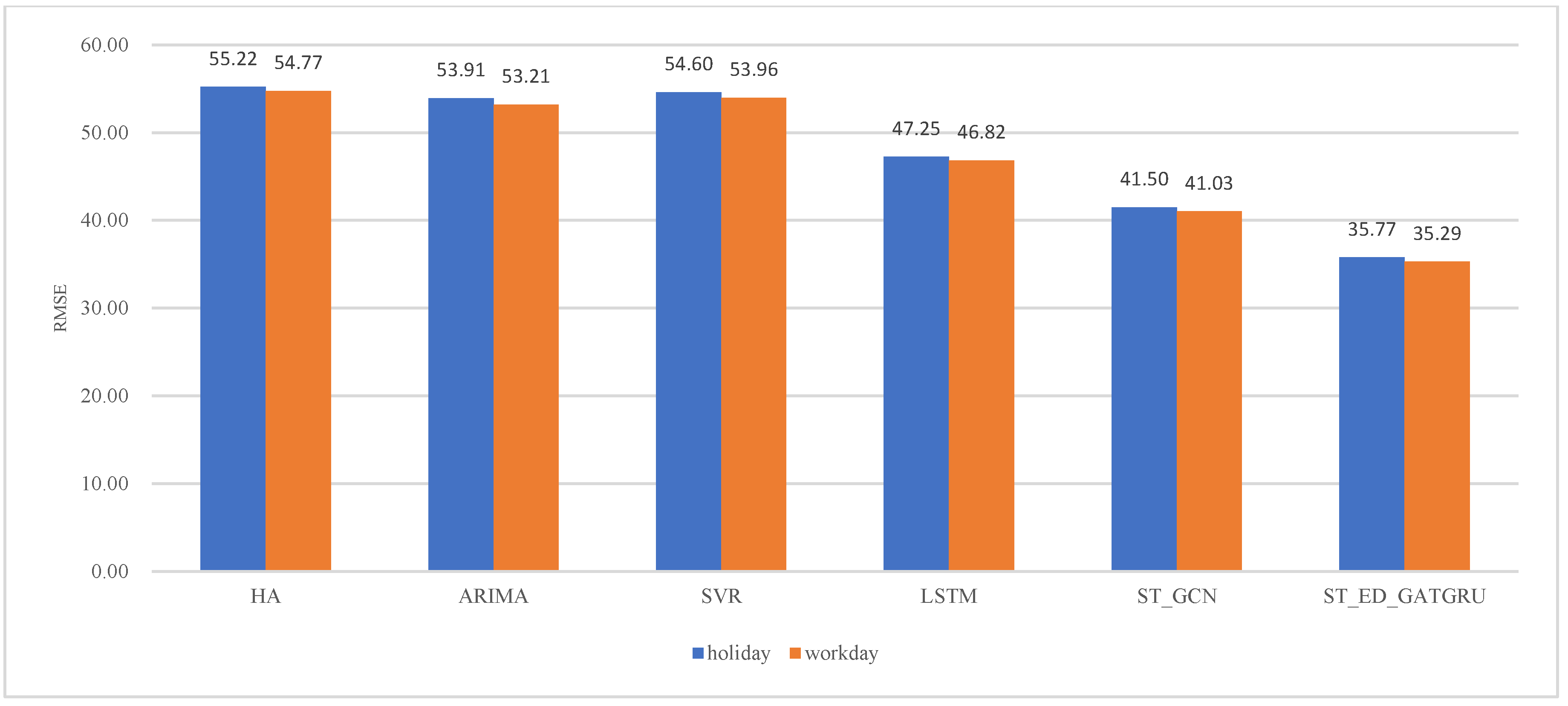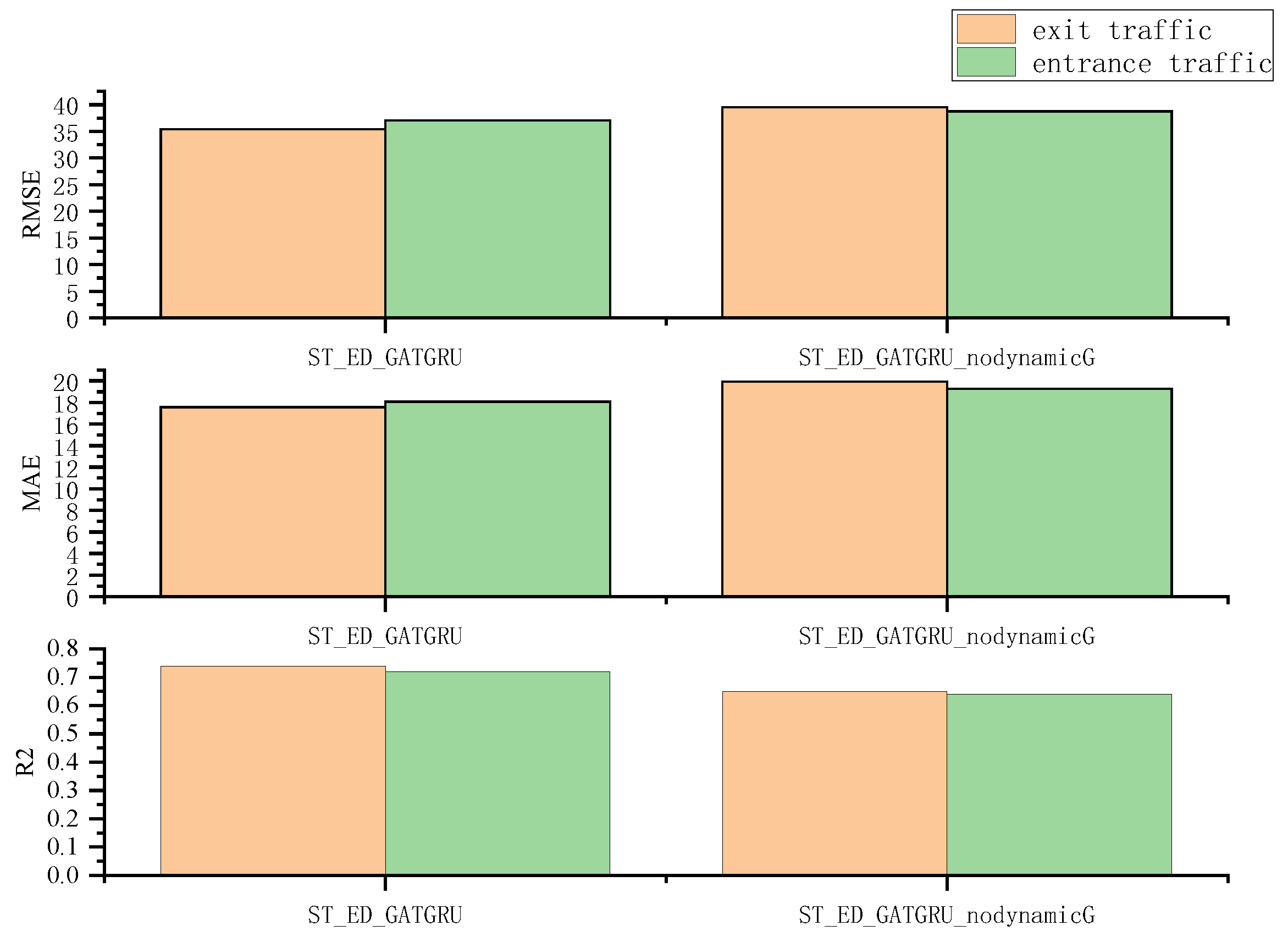 - In terms of ablation experiment analysis, the ST_ED_GATGRU model for exit traffic flow prediction performance improved by 0.26 in RMSE, 0.25 in MAE, and 1.35% in R2, and the ST_ED_GATGRU model for exit traffic flow prediction performance improved by 0.87 in RMSE, 0.08 in MAE, and 4.17% in R2. This study assesses the influence of distinct modules within the proposed model on the accuracy of the entire model.