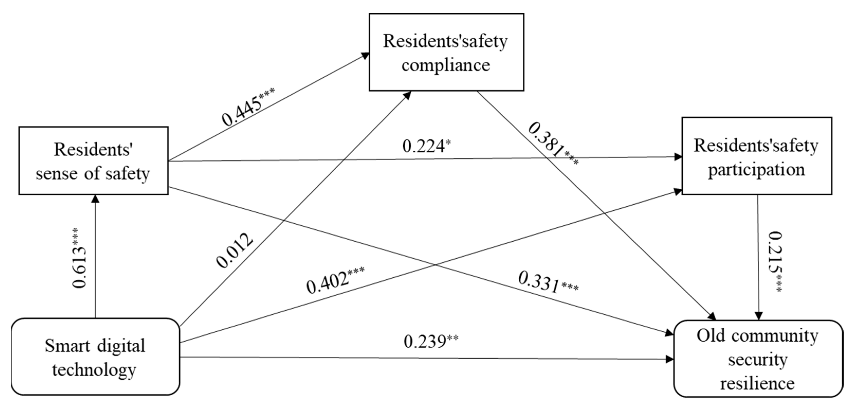 - The path coefficient between smart digital technology and community security resilience was significant (β = 0.239, p < 0.01), confirming hypothesis H1a.