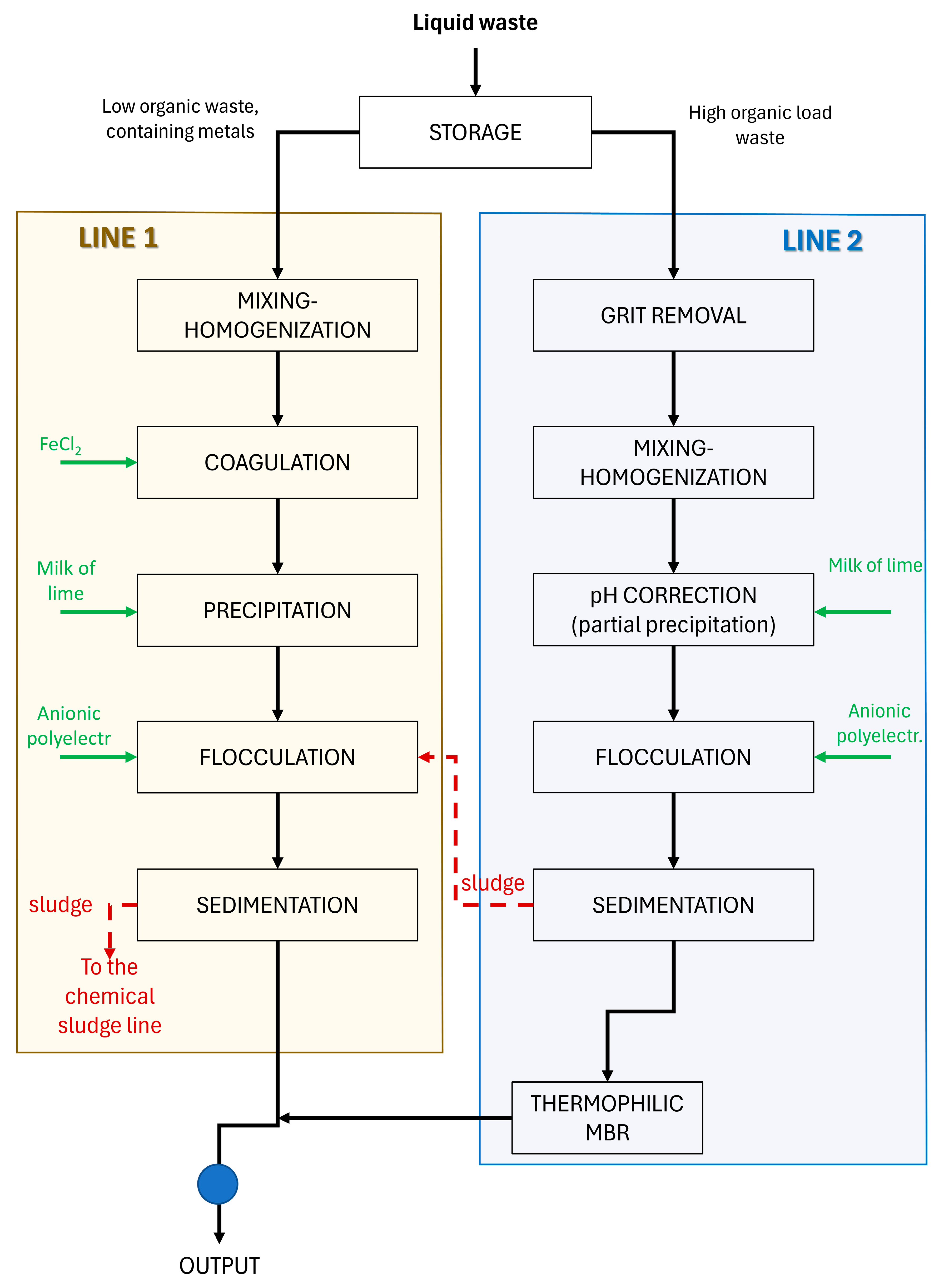 | High concentrations of heavy metals (≥100 mg/L) | Line 1—chemical–physical treatment only |