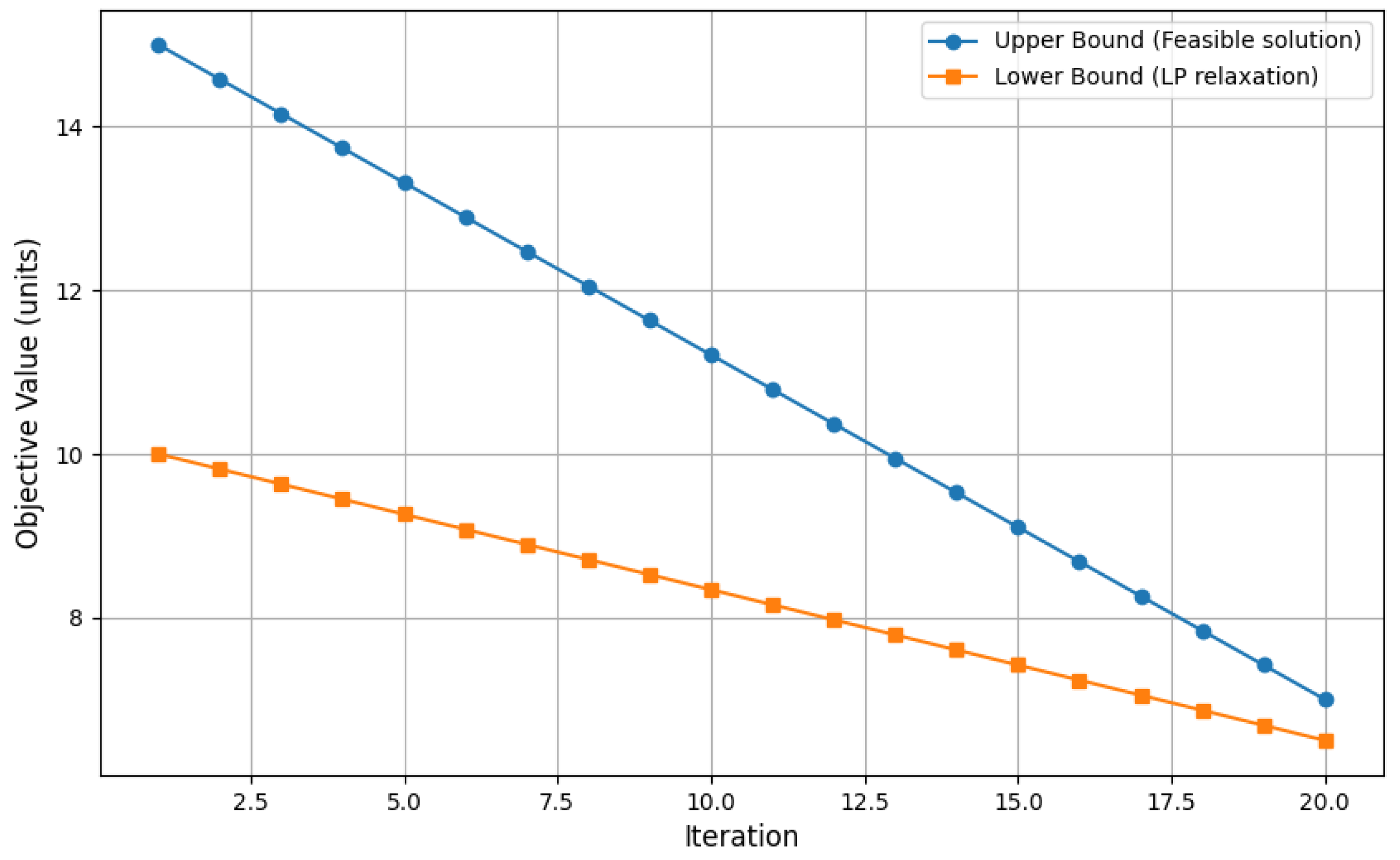 Figure 1, the plot shows the progression of the upper bound and lower bound of the objective function during the optimization process using the MILP solver. The upper bound represents the best feasible solution found so far. The lower bound represents LP relaxation (i.e., an optimistic estimate where integrality constraints are relaxed). Both bounds improve (decrease) over iterations, and the gap between them narrows, indicating convergence of the solver toward the optimal solution. This reflects healthy solver performance and good formulation tightness. The upper bound starts at a higher value (≈15 units) and decreases steadily to the final objective value (≈7 units), showing that the solver finds increasingly better feasible routes. The lower bound starts lower (≈10 units) and gradually increases, reflecting tighter estimates of the minimum possible objective. The shrinking gap between the bounds indicates convergence toward an