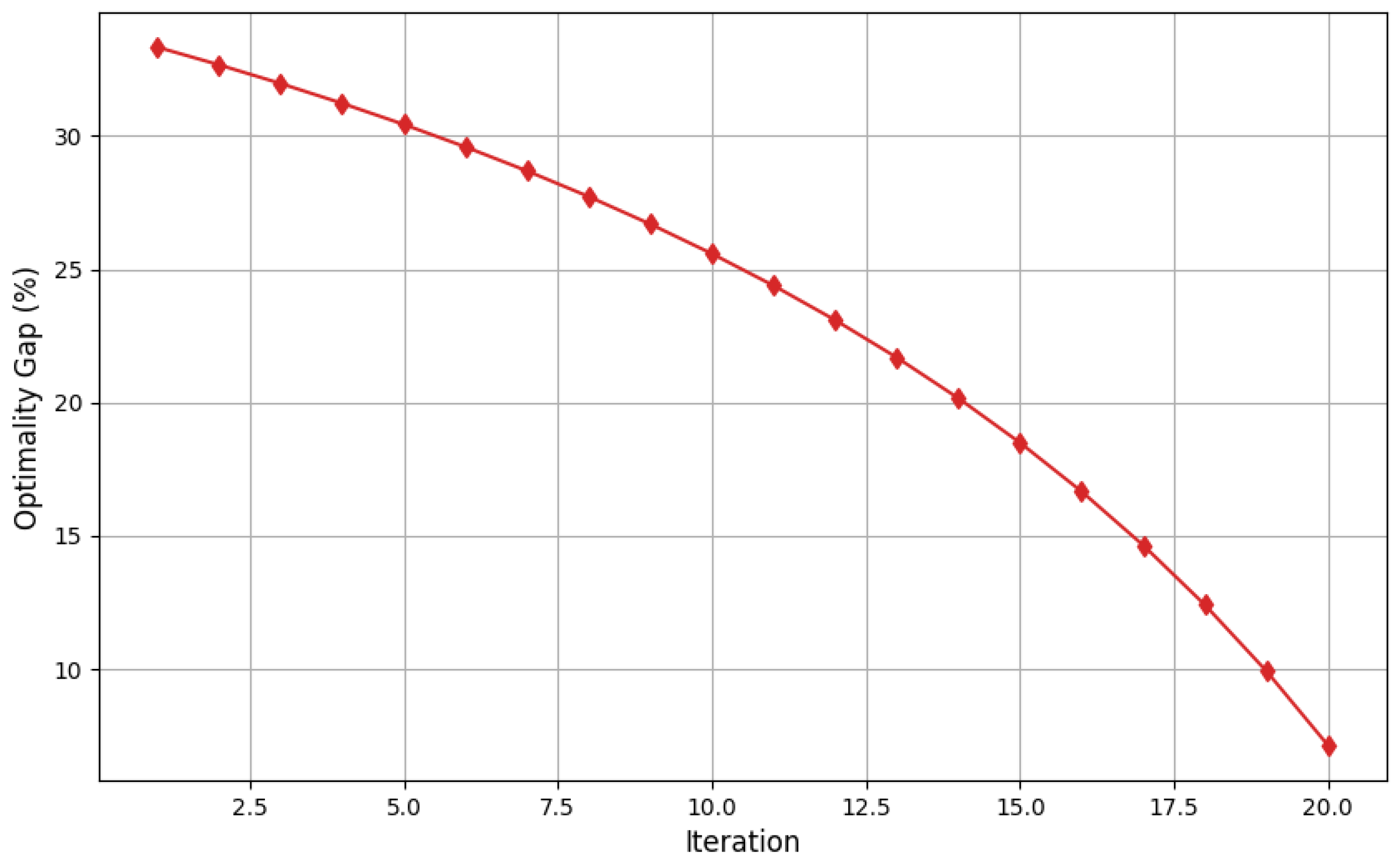 -optimal solution. By iteration 20, the gap is sufficiently small, confirming that the solver’s output is close to the true optimum.