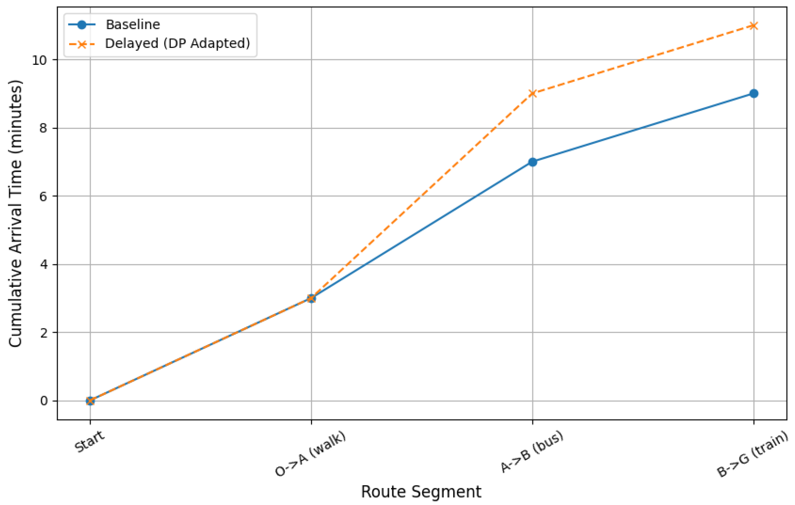 In the baseline case, the traveler reaches node A at approximately 3 min, node B at 7 min, and the final destination G at 9 min. Under the delayed scenario, the DP-based adaptation results in arrival times of about 3 min at node A, 9 min at node B, and 11 min at node G. Numerically, this indicates that the delay introduces an additional 2 min at node B and increases the total travel time by about 2 min (from 9 to 11 min). While the adapted plan incurs higher cumulative times, it successfully maintains route feasibility despite disruptions, demonstrating the capability of the DP approach to re-optimize decisions dynamically in response to real-time delays.