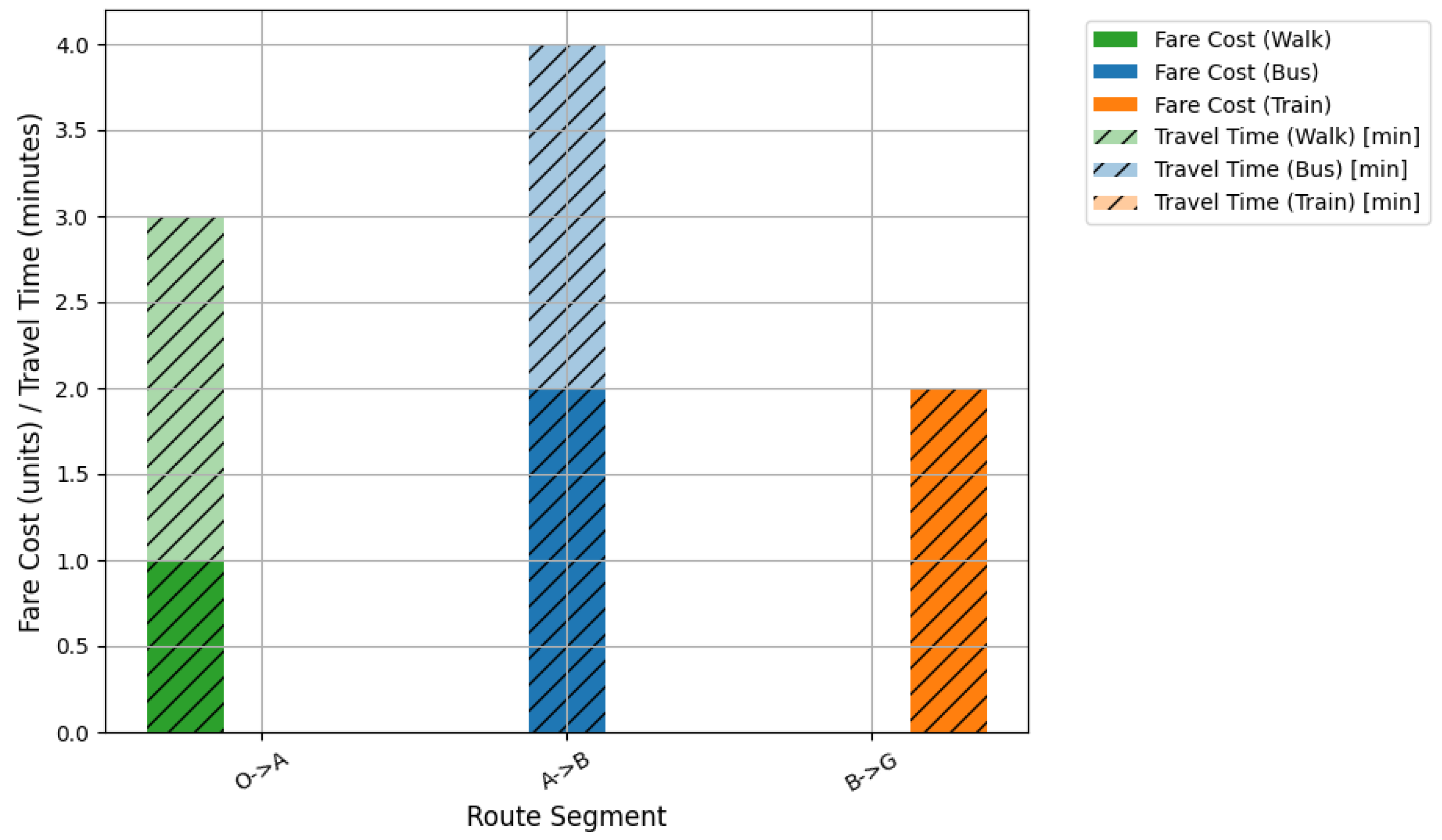 For the walking segment , the fare cost is 1 unit with a travel time of 3 min. The bus segment incurs a fare cost of 2 units and a travel time of 4 min, representing the highest travel time among all modes. Finally, the train segment has a fare cost of 2 units and a travel time of 2 min, making it the fastest segment despite incurring an additional fare. Overall, the combined route results in a total fare of 5 units and a cumulative travel time of 9 min. These results highlight that the bus segment contributes the most to travel time, while the train provides a fast connection but at a higher cost, and walking adds a moderate cost and time burden.