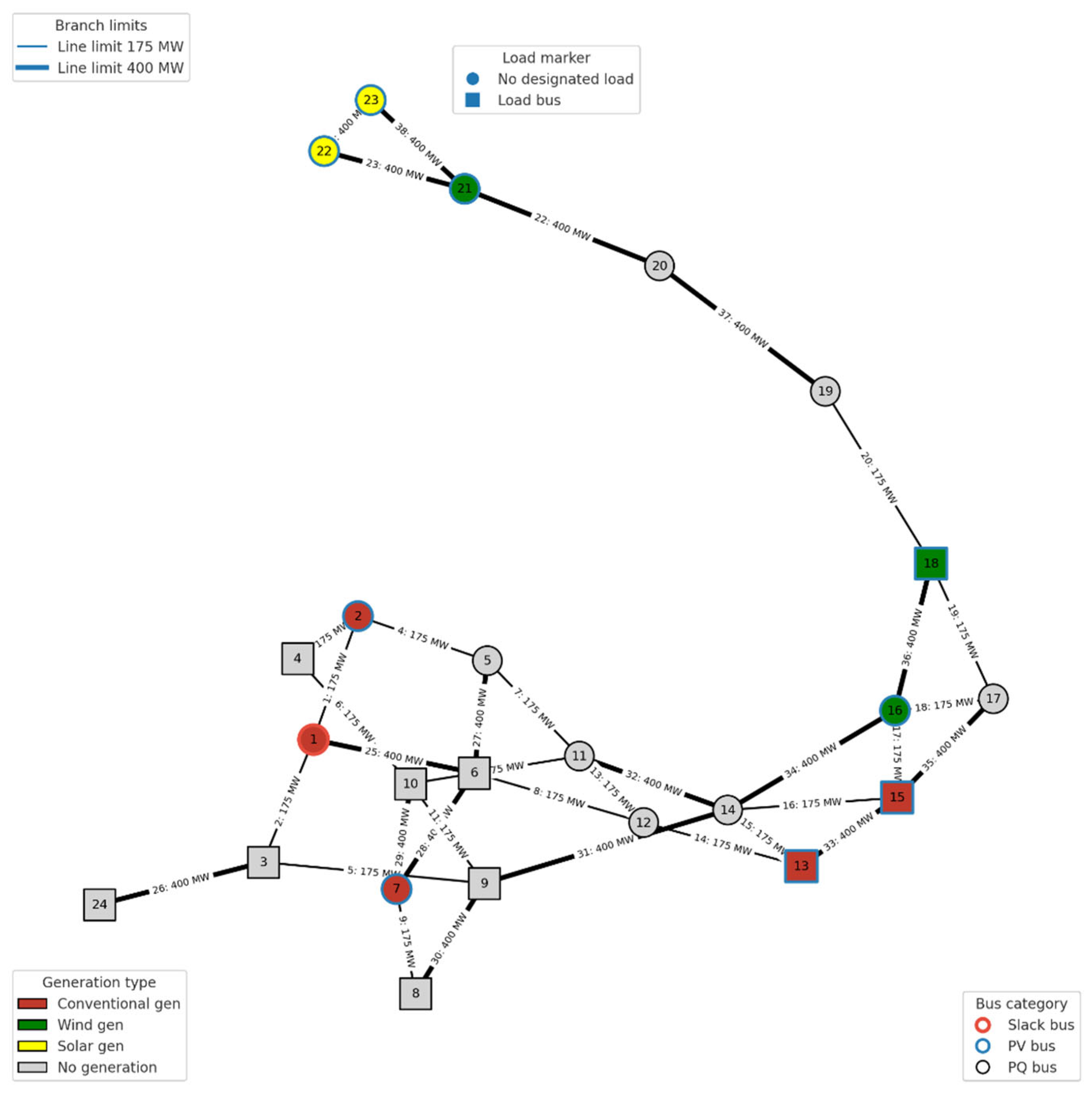 - Thermal limits: 175 MW (AC lines 1–20), 400 MW (AC lines 21–28, DC lines).