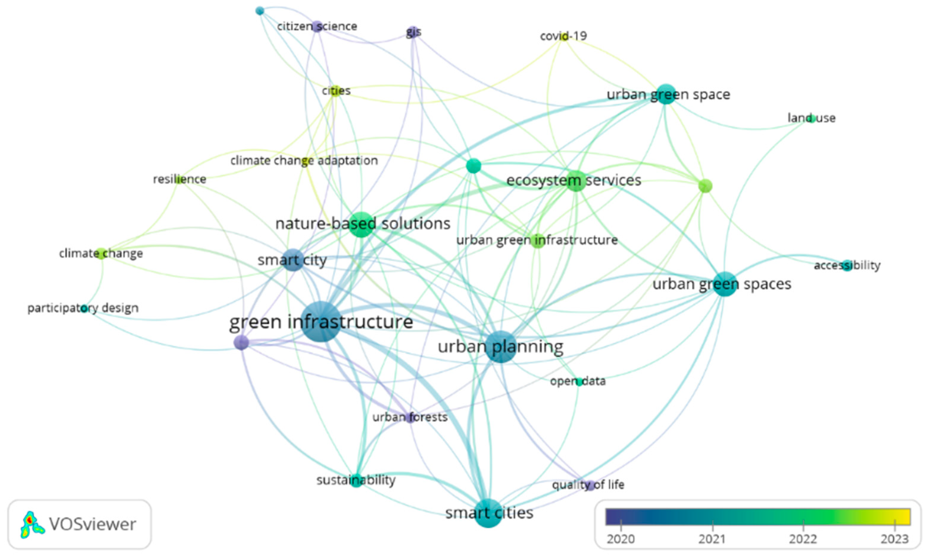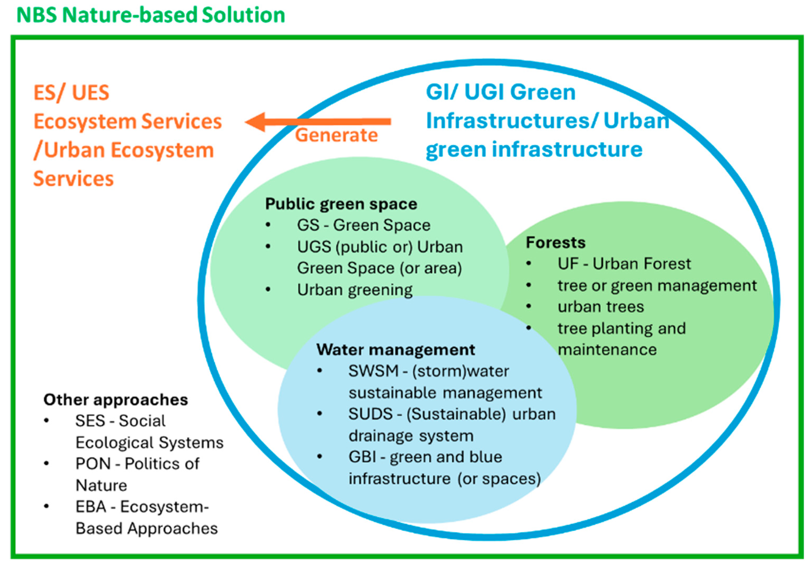 | Cited terms | NBS—Nature-Based Solutions | ES—Ecosystem Services UES—Urban Ecosystem Services | GI—Green Infrastructure UGI—Urban Green Infrastructure | GS—Green Space UGS (public or) Urban Green Space (or area) “Urban greening” | UF—Urban Forest “tree or green management” “urban trees” “tree planting and maintenance” | SWSM—(Storm)Water Sustainable Management SUDS—(Sustainable) Urban Drainage System GBI—Green and Blue Infrastructure (or spaces) | SES—Social Ecological Systems PON—Politics of Nature EBA—Ecosystem-Based Approaches |