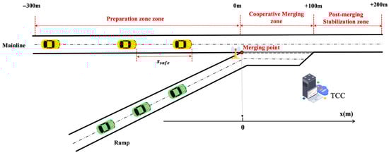 In the proposed cloud control architecture, a traffic control center (TCC) located at the entrance of the merging area collects real-time vehicle state information through Vehicle-to-Infrastructure (V2I) communication. The TCC processes this information to generate optimal trajectories for all vehicles within the control zone, which spans from 300 m upstream of the merging point to 100 m downstream. For clarity, the control zone is explicitly divided into three functional subzones, as illustrated in Figure 1: (1) the Preparation Zone (−300 m to 0 m), where vehicles establish communication with the TCC and prepare for cooperative control; (2) the Cooperative Merging Zone (0 m to +100 m), where active trajectory adjustments and merging maneuvers occur; and (3) the Post-merging Stabilization Zone (+100 m to +200 m), where vehicles stabilize their speeds and prepare to exit the control system. The distances are now shown directly in the figure to ensure consistency with the text, and the overall control zone is explicitly indicated.