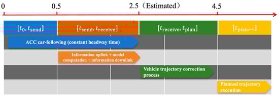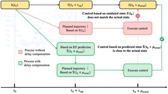 The deterministic component of communication delay (mean delay ) causes a systematic time lag between state measurement and control execution. Without compensation, the TCC would base its trajectory planning on outdated vehicle states, leading to suboptimal or potentially unsafe control decisions, as shown in Figure 2.